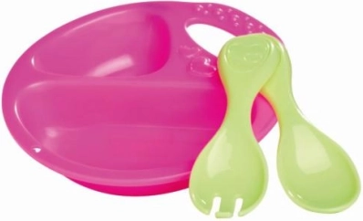 Kerged plastnõud ümarate vormide ja ergonoomiliste söögiriistadega toetavad iseseisvat mängu ja peenmotoorikat.