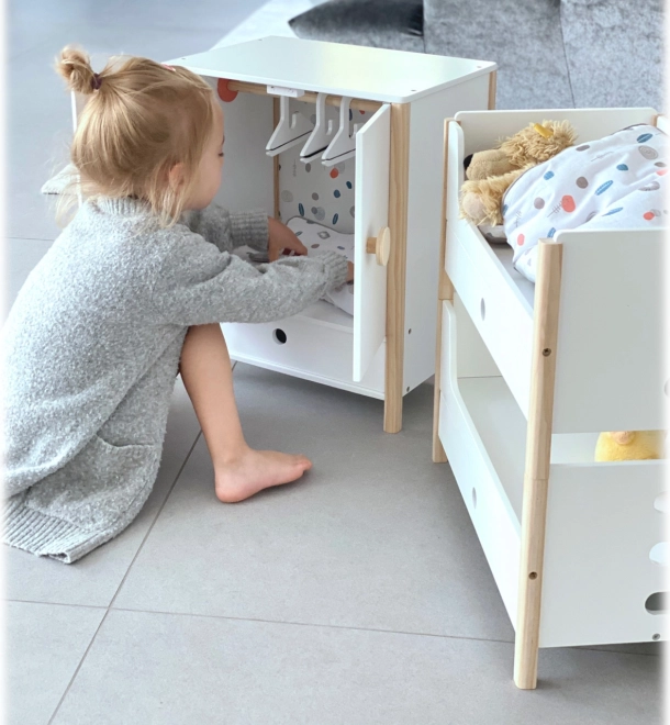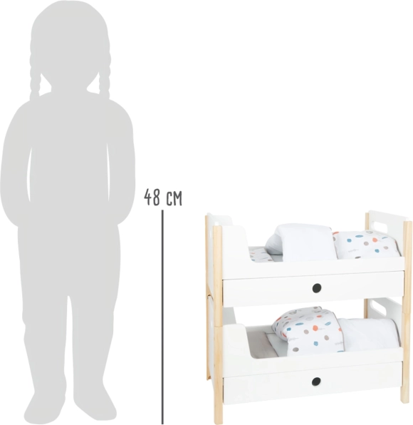 Komplekti kuuluvad neutraalsetes toonides voodiriided ja oversized‑tekid, mis mahutavad mugavalt nukud või kaisuloomad kuni 46 cm. Iga voodi all olevad sahtlid pakuvad nutikat hoiustust rõivastele ja väikestele lisatarvikutele. Ideaalne täiendus lastetuppa või stiilsesse nurgakesse nukkudele Little Button kollektsioonis.