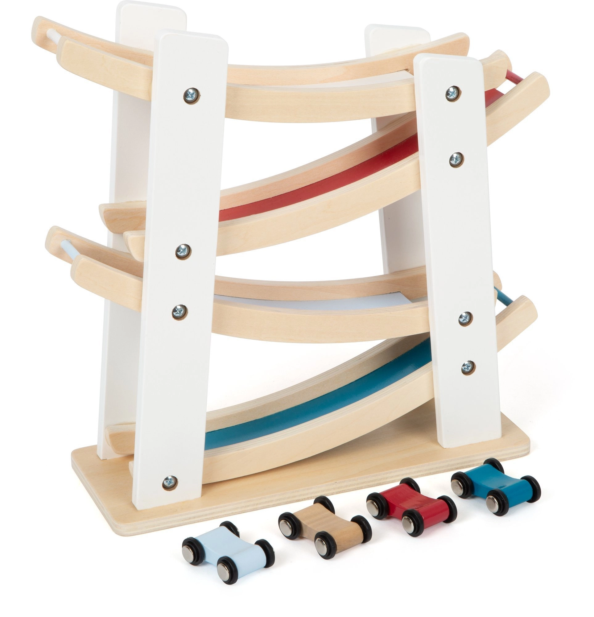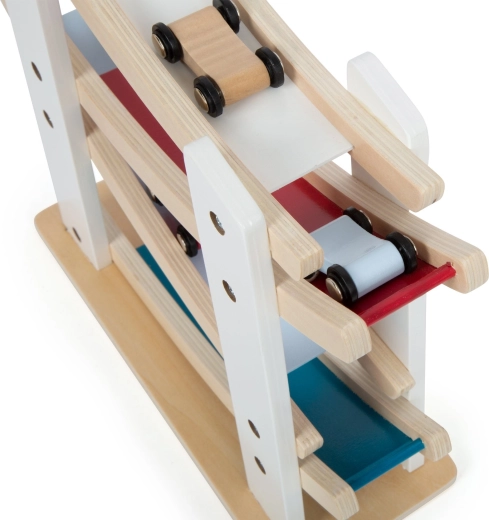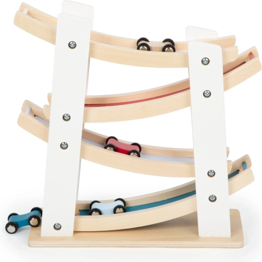 See kvaliteetne puidust rada pakub lihtsat põhimõtet, mida lapsed armastavad: aseta auto ülemisele platvormile ja vaata, kuidas see hoogsalt mööda kurve alla libiseb. Stabiilne alus ja siledad pinnad tagavad turvalise ning vastupidava kasutuse.