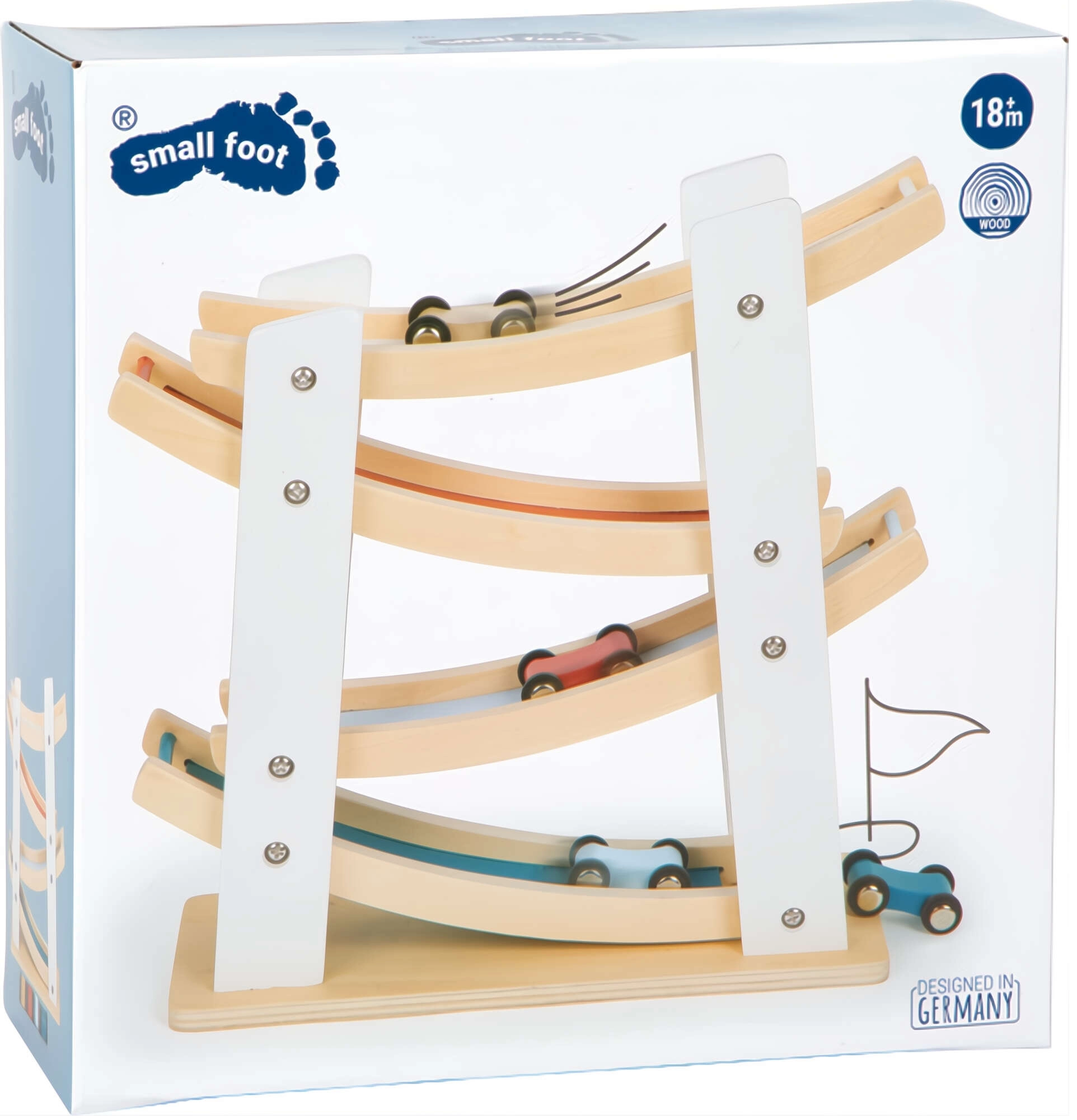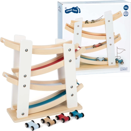 Avasta pisipõnnidele mõeldud lõbu koos Small Footi puidust võidusõiduraja ja autodega. Tugev looduslikust puidust konstruktsioon, neli värvilist autot ja sujuv liuglemine kaskaadrampidel arendavad peenmotoorikat, käe-silma koordinatsiooni ning põhjuse-tagajärje mõistmist. Ideaalne mänguasi alates 18. elukuust igapäevaseks loominguliseks mänguks.