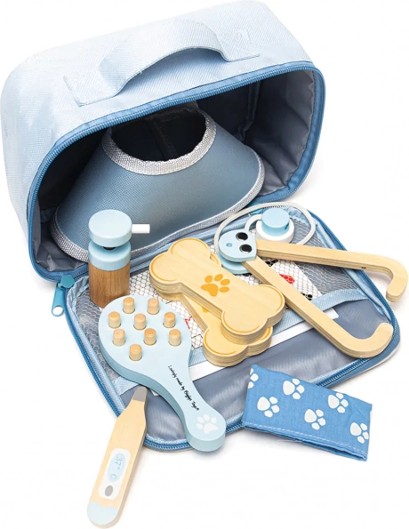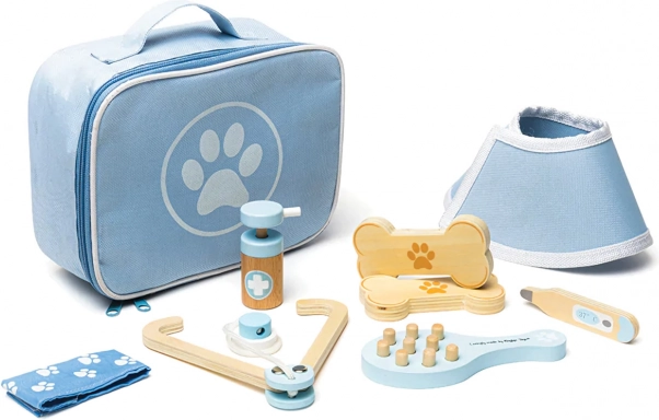 Komplektne veterinaarikohver võimaldab lastel hoolitseda kaisuloomade ja lemmikloomakujukeste eest nagu päris arst. Komplektist ei puudu tööriistad nagu stetoskoop, termomeeter, otoskoop, süstal, side, hari, kaitsekrae ja muud tarvikud. Kõik on paigutatud vastupidavasse tekstiilkotti käpajäljega, ideaalne kandmiseks ja hoiustamiseks.
