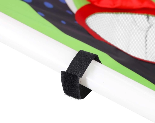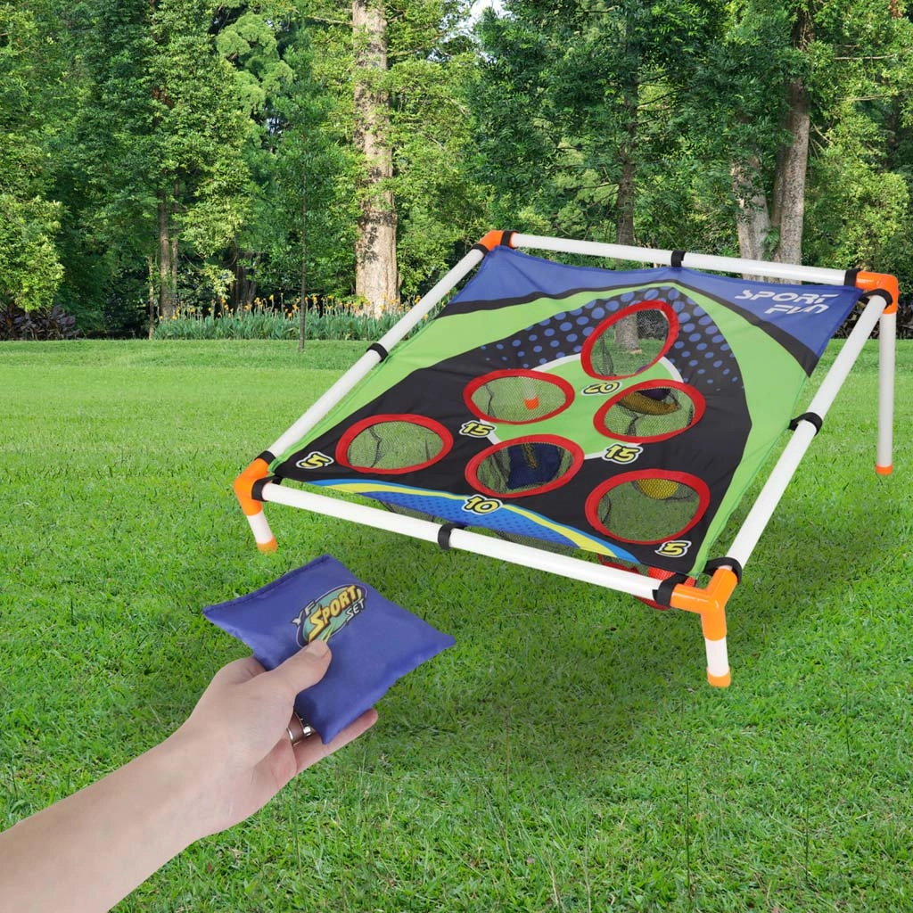 Kerge plasttorudest konstruktsioon kallutatud alusega tagab stabiilsuse, vastupidav tekstiilpind viie kuni kuue punktiga tähistatud avaga püüab kotikesed ja pallid kinni võrkkottidesse. Kokku panemine on intuitiivne ja kogu mänguväljakut on lihtne kõikjale kaasa võtta.