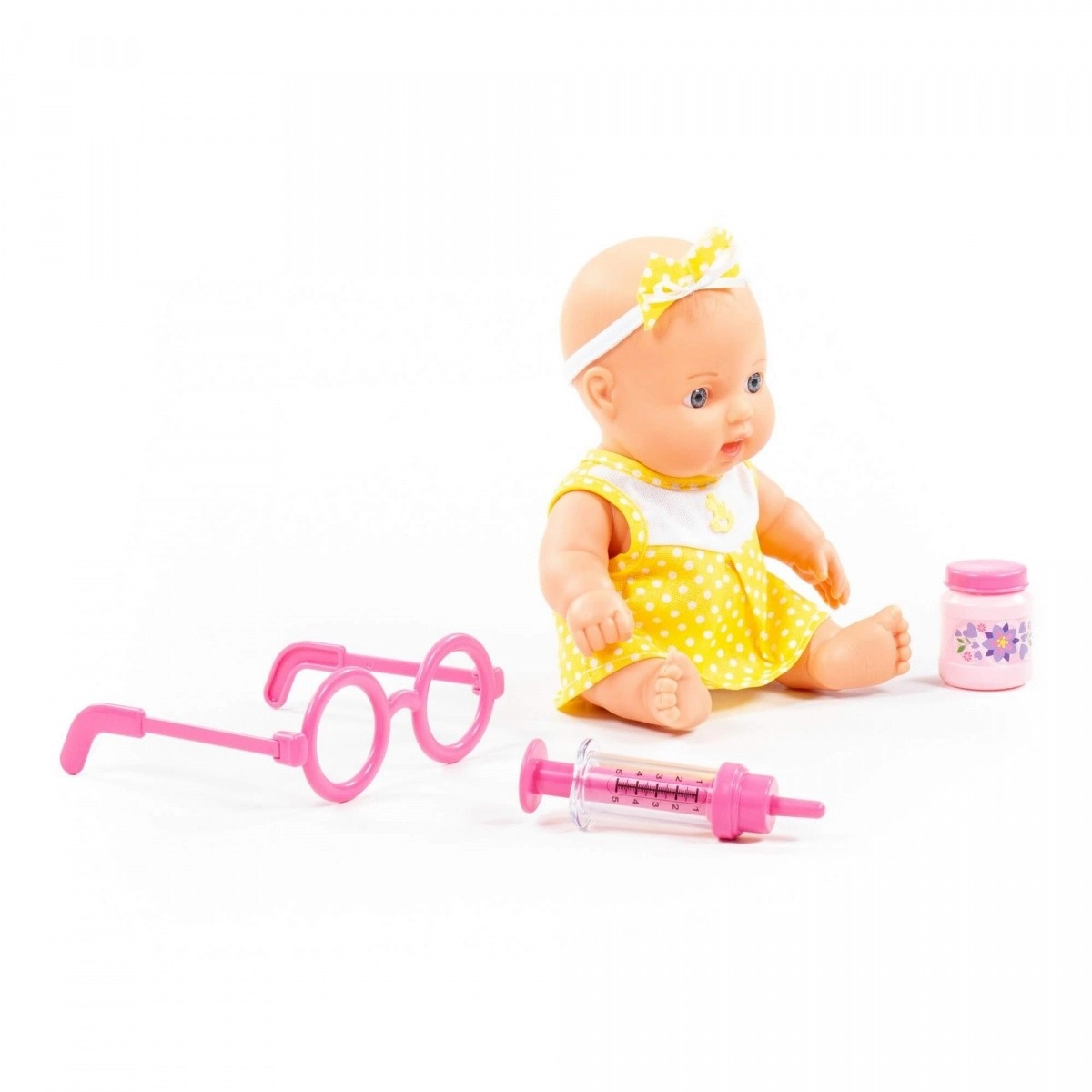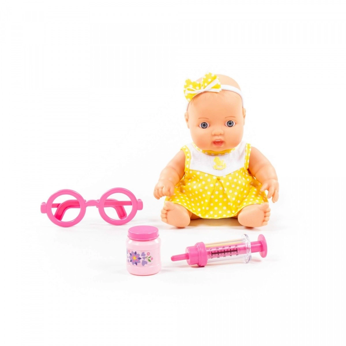 See realistlik nukk kollases täpilises lipsukesega kleidis on loodud väikestele hoolitsejatele. Tänu liikuvatele kätele ja jalgadele on seda lihtne hoida ja käsitseda. Arstipagas toetab loomulikku uudishimu ning õpetab lapsi empaatia ja hoolivuse kaudu.