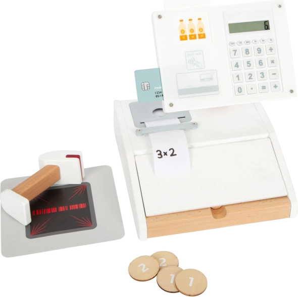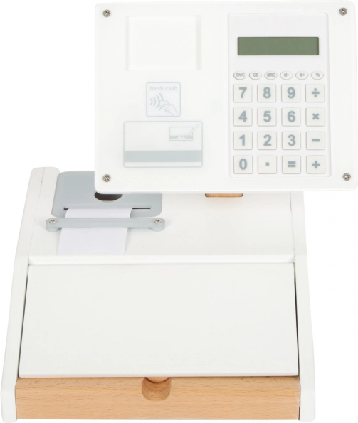 Puidust kassaaparaat SMALL FOOT Fresh muudab iga mängunurga pisikeseks supermarketiks. Tänu integreeritud kalkulaatorile pööratavas ekraanis saavad lapsed ostu hõlpsalt kokku arvutada, avada suure sahtli müntide lahtritega ja proovida sularahata makset oma kaardi ning allkirjaga pleksiklaasil.