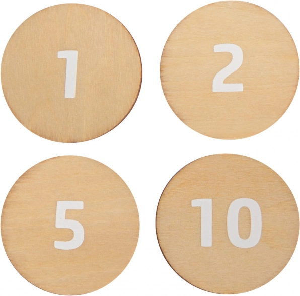 Kahepoolsed puidust mündid ja tootekaardid aitavad lastel mänguliselt harjutada arvutamist, väärtuste äratundmist ja põhiteadmisi rahakasutusest.