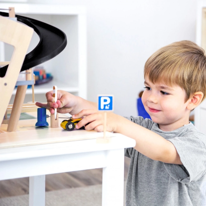 See stiilne puidust võidusõidu parkla toob laste jaoks rikkalikult varustatud mängumaailma. Kolm korrust on ühendatud toimiva lifti ja kahe sujuva kaldteega, mis võimaldavad autodel sujuvalt liikuda. Igal tasandil on mehaaniline tõkkepuu ja kummist servapiirded, mis lisavad dünaamikat ja takistavad sõidukite mahalibisemist. Värvilised ikoonid ja liiklusmärgid toetavad õppimist läbi mängu ning arendavad kujutlusvõimet.