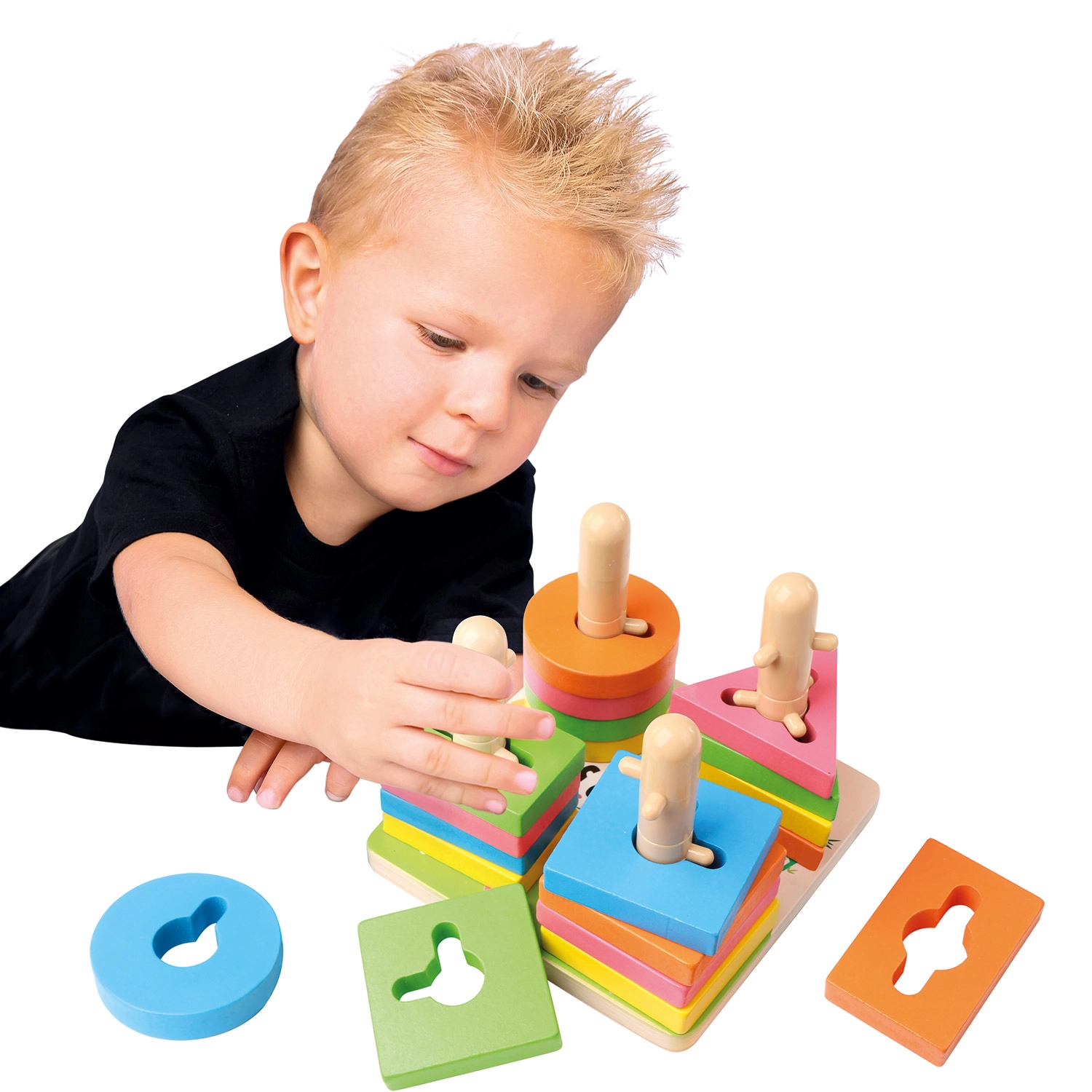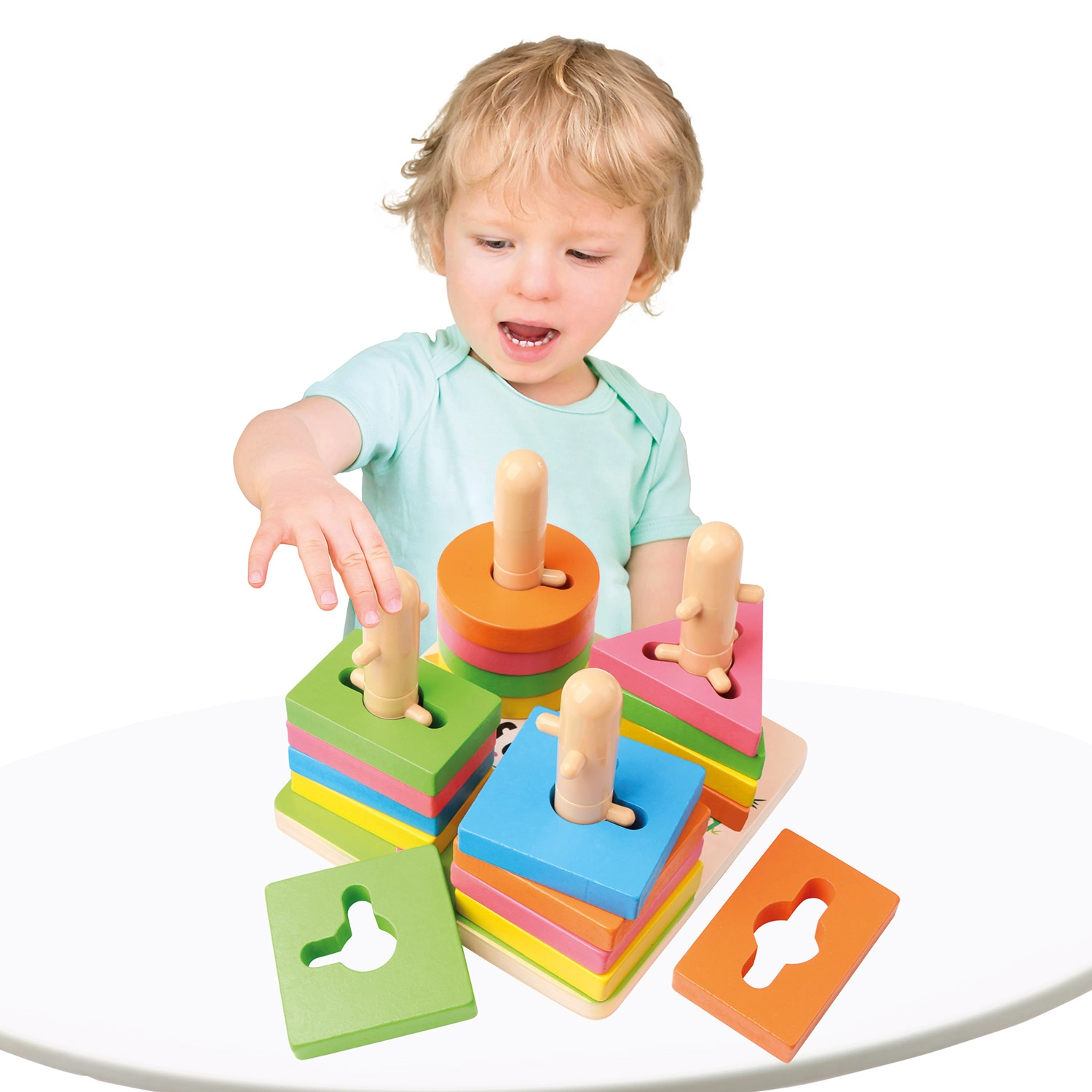 Värvilised geomeetrilised tükid koos väljalõigetega aitavad lastel loomulikult eristada kujundeid ja värve, arendades samal ajal loogikat ja keskendumist.