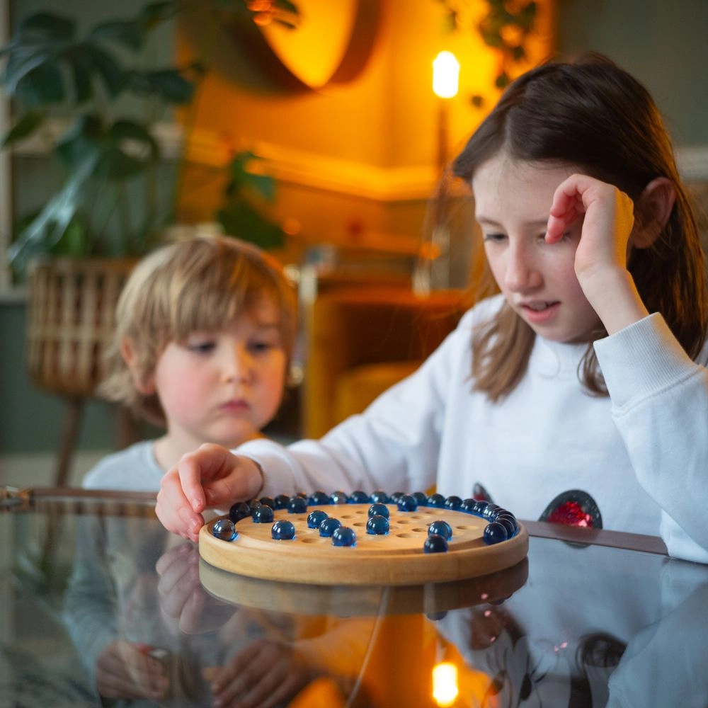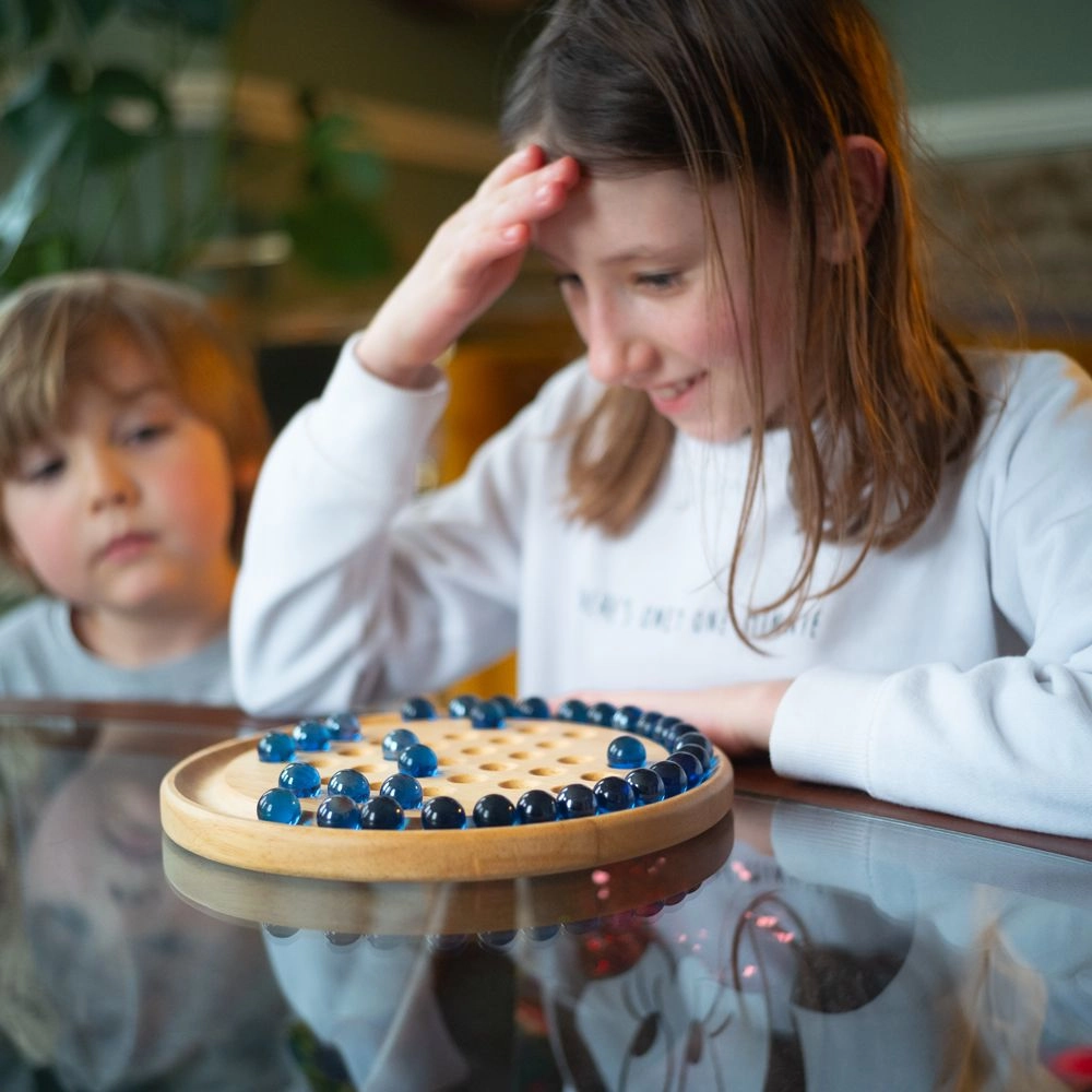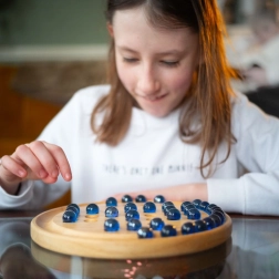 Sile puidust ümmargune alus ja läikivad klaaskuulid tagavad mõnusa mängutunde ja pika vastupidavuse.