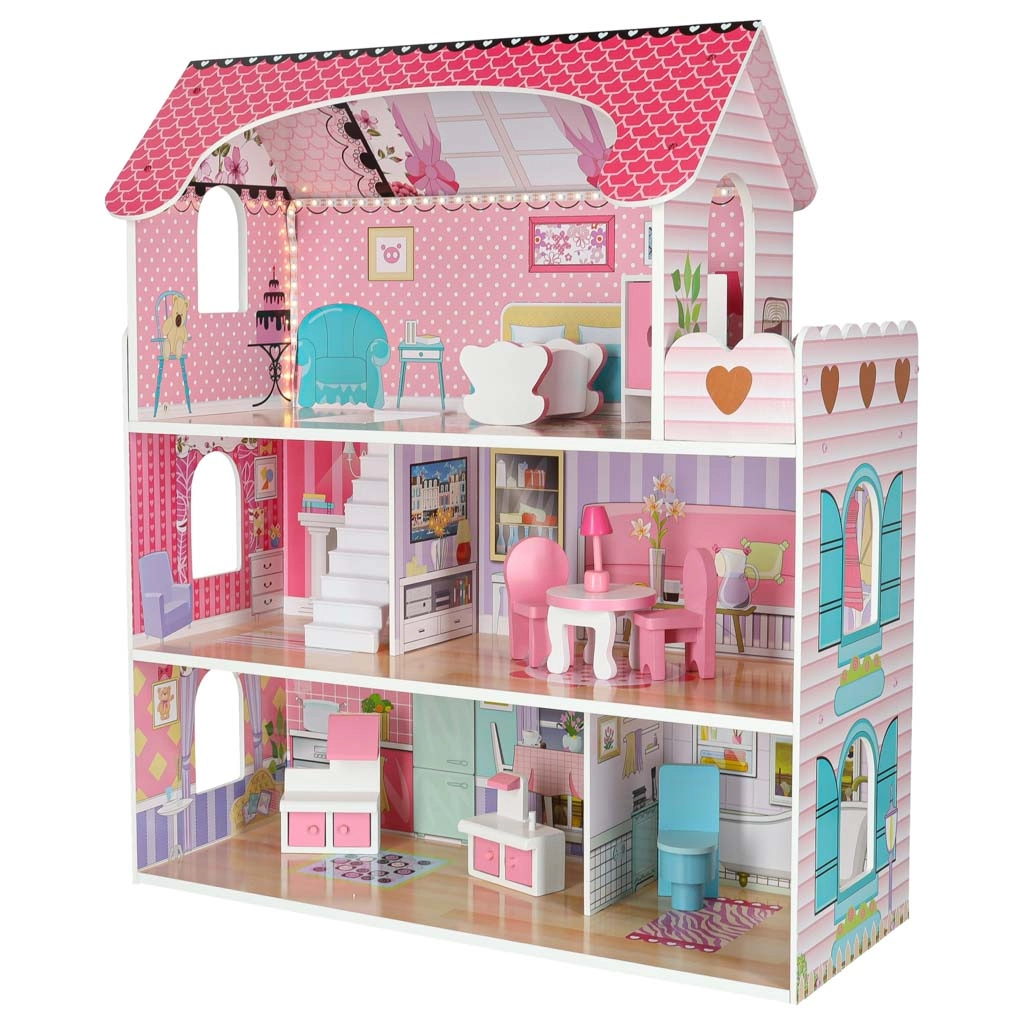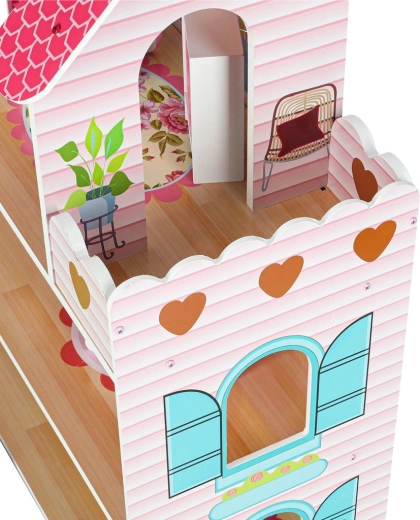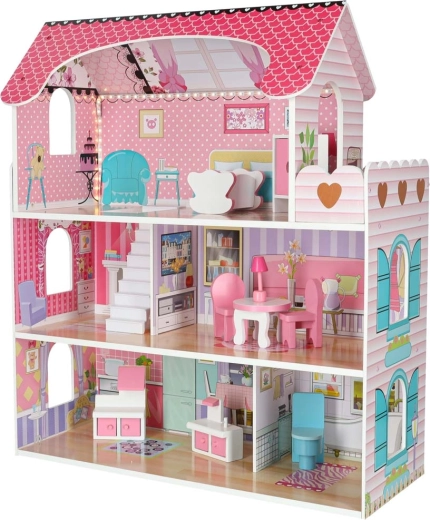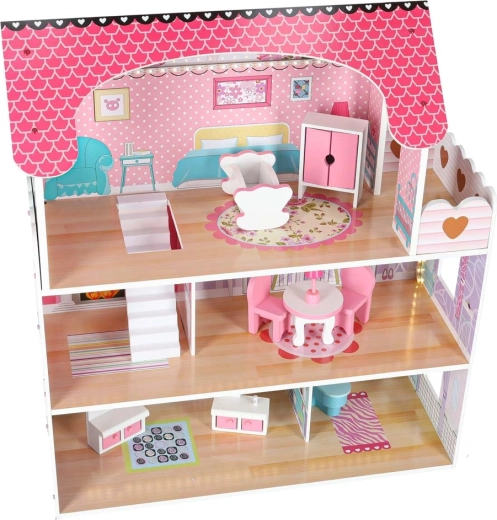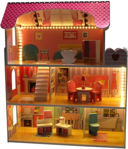 Stiilne 70 cm kõrgune puidust nukumaja pakub kolme korrust, 5 hubast tuba ja terrassi. Tänu LED-valgustusele (külm valge) särab see nagu päris kodu ning võib toimida ka öölambina. Komplekti kuulub puidust mööblikomplekt avanevate ustega ning detailsete seinatrükistega veelgi realistlikumaks mänguks.
