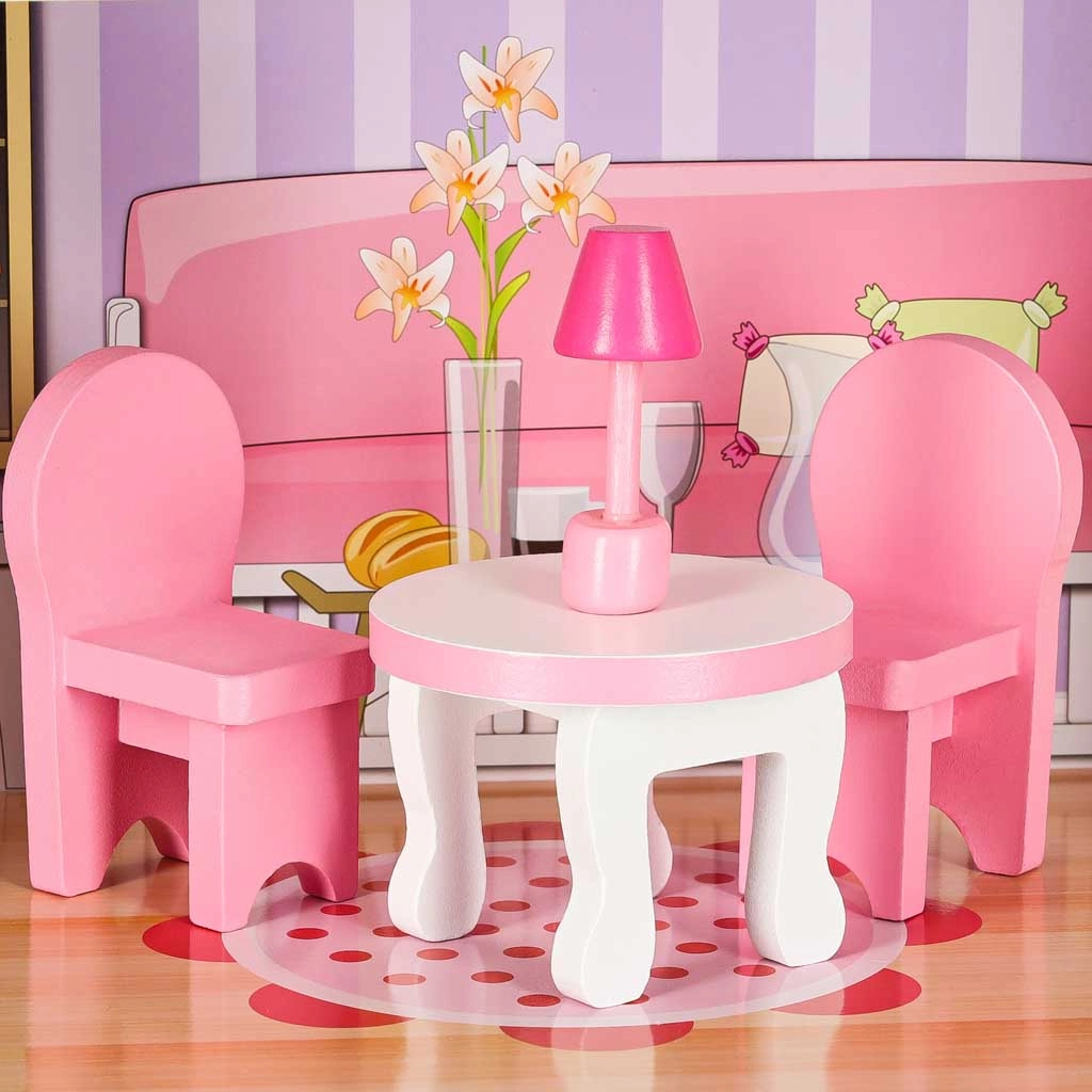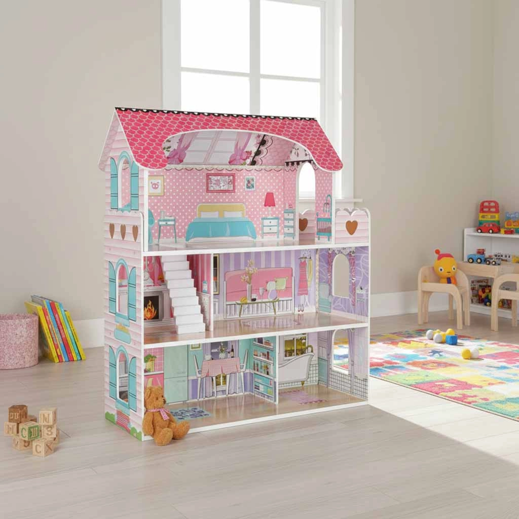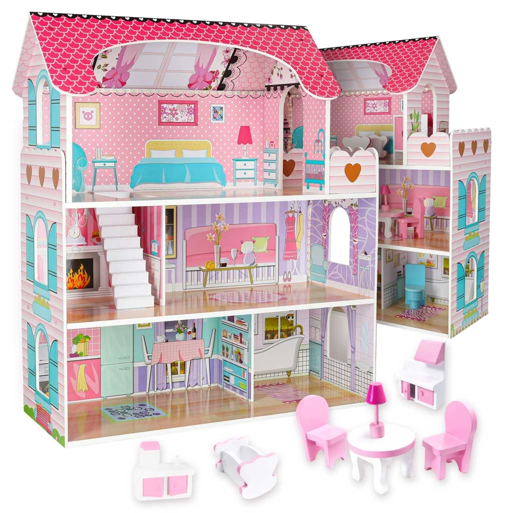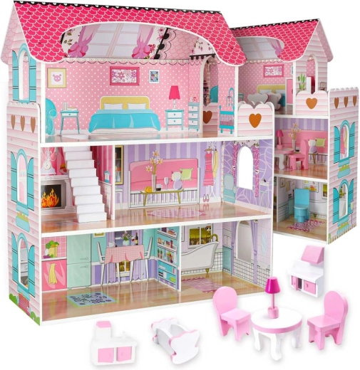 Suur puidust nukumaja rõõmustab nii lapsi kui ka vanemaid. Kolm avarat korrust peidavad endas kööki, vannituba, magamistuba, elutuba ja treppi rõduga. Rikas puidust lisade komplekt ja realistlikud seinatrükised toetavad loovat rollimängu ja peenmotoorika arengut.
