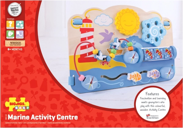 See mereteemaline puidust tegevustahvel pakub lastele rohkelt tegevusi: pöörlev labürint, keerlevad merihobud, liuglevad kalakesed ja helmestega traat koos kajakatega. Iga element on loodud toetama oskuste loomulikku arengut, kannatlikkust ja keskendumist. Tänu reguleeritavatele kinnitustele saab tahvli turvaliselt ka voodi külge kinnitada, pakkudes beebile stimuleerivat mänguaega käeulatuses.