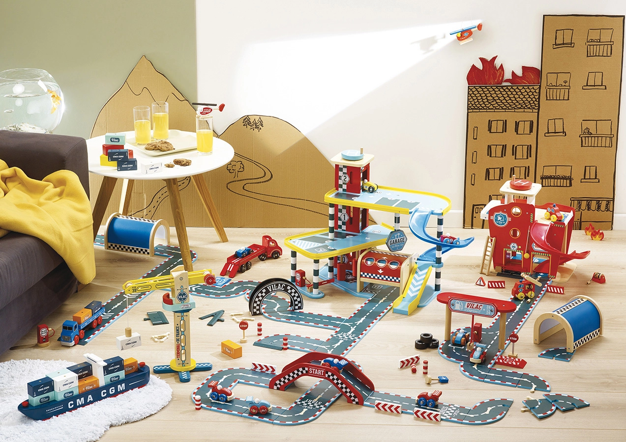 Suur VILAC Vilacity puidust garaaž on ideaalne linnatranspordi keskus kõigile väikestele võidusõitjatele. Tänu läbimõeldud mehaanilistele detailidele, nagu töötav lift, tõkkepuu ja pesula, arendavad lapsed peenmotoorikat, fantaasiat ja loogilist mõtlemist. Komplektis on kaks autot ja helikopter, nii et mäng võib alata kohe pärast kokkupanekut.