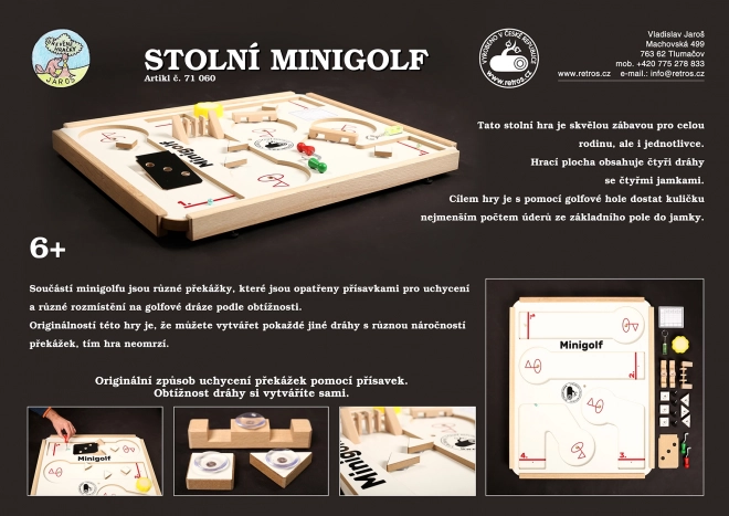 Avasta lõbu, mis ei muutu kunagi igavaks: lauaminigolf vabalt paigutatavate takistustega neljal rajal. Tänu iminappadega kinnitusele saad luua alati erineva ja väljakutsuva raja. Suurepärane koduseks meelelahutuseks ning ka koolide pikapäevarühmadesse ja klubidesse. Kvaliteetne teostus ja valmistatud Tšehhi Vabariigis.