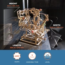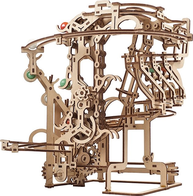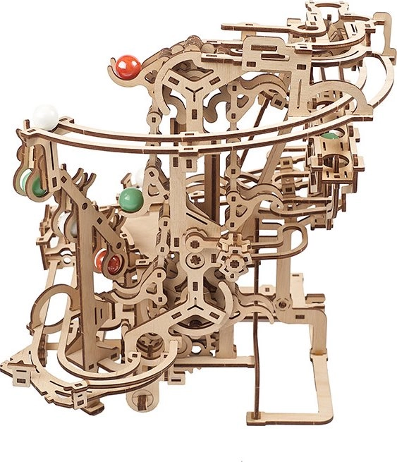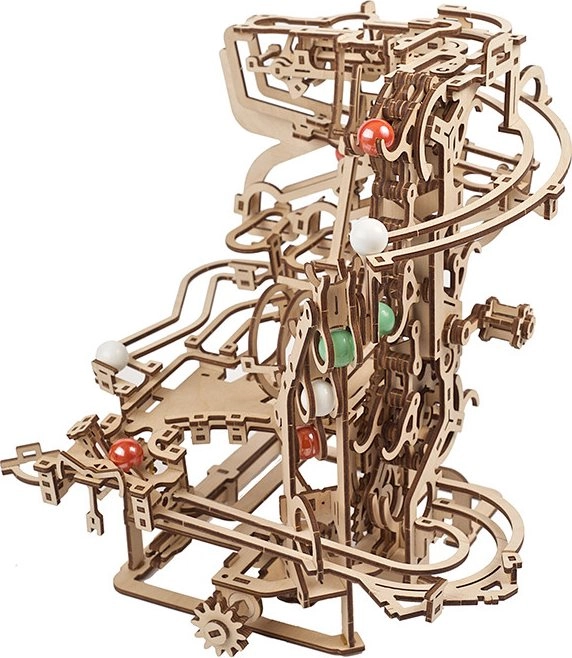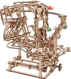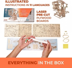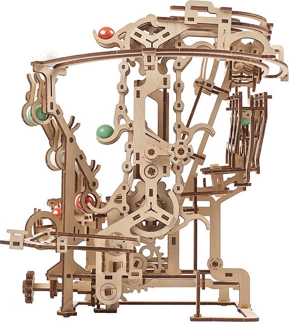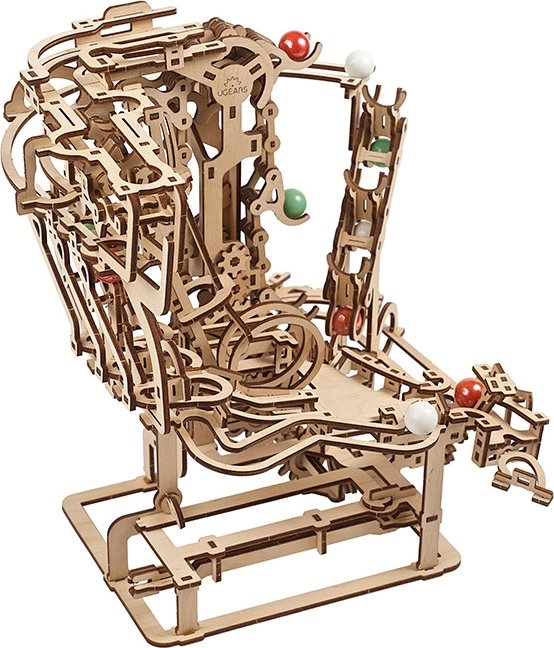 See peenelt läbimõeldud kuulirada kvaliteetsest vineerist ühendab meisterdamisrõõmu, haridusliku väärtuse ja lõõgastava vaatemängu. Käsitsi juhitav kett-tõstuk toimetab kuulid sujuvalt stardipositsioonile, kust need liiguvad mööda kolme eraldi sektsiooni, igas omaette põhjtakistus. Avatud disain toob esile töömehaanika ja peened detailid.