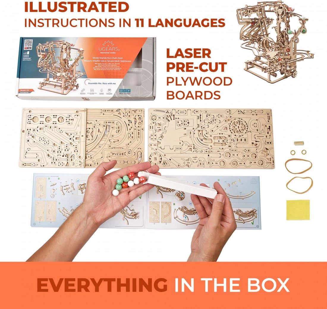 Avastage lõbu ja tehniline elegants UGEARSi komplektiga – puidust mehaaniline kuulirada koos ketiajamiga. Käsitsi juhitav mehhanism paneb värvilised kuulid liikuma kolmel ainulaadsel rajal koos takistustega, samal ajal kui avatud konstruktsioon võimaldab imetleda ülekandeid ja hammasrattaid töös. Mudelit saab ühendada teiste komplektidega, et luua veelgi suurejoonelisem rada. Täiuslik valik loovatele entusiastidele, kes armastavad väljakutseid ja täpseid puidust mudeleid.