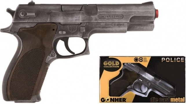 Stiilne politseipüstol kollektsioonist Gold Edition elegantses hõbedases metallviimistluses, mõeldud 8-lasulistele kapslitele. Suurepärane valik laste politseimängudeks ja ka kollektsionääridele, kes hindavad kvaliteetset teostust ja autentset välimust.