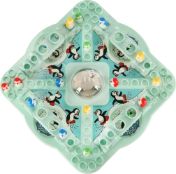 - mängulaud pop-up täringuga, 16 pingviininuppu (4× sinine, 4× kollane, 4× roheline, 4× punane), 4 silda