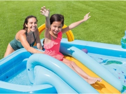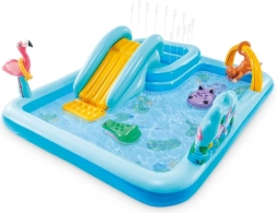 Too oma aeda veemaailma rõõmud INTEXi mängukeskusega. Lai liumägi pehme alusega tagab õrna ja ohutu maandumise, samal ajal kui madal loik ja suurem bassein pakuvad värskendust kuumadel päevadel. Integreeritud purskkaev reguleeritava veevooluga lisab mängule uue mõõtme.