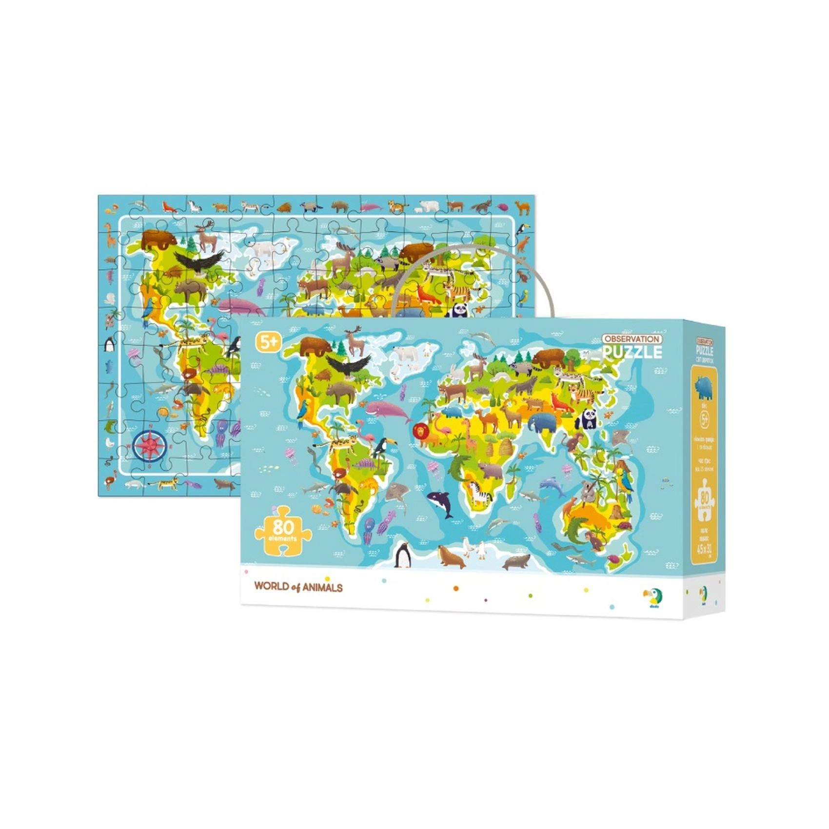 Avastage loomariiki nende värviliste pusledega, mis pakuvad lastele nii meelelahutust kui ka õpet. Pärast kokkupanekut saavad nad mängida mängu Leia ja otsi ning määrata loomade asukoha maailma kaardil. Hariv pusle koos 80 tükiga toetab tähelepanu arengut, peenmotoorikat ja loogilist mõtlemist.