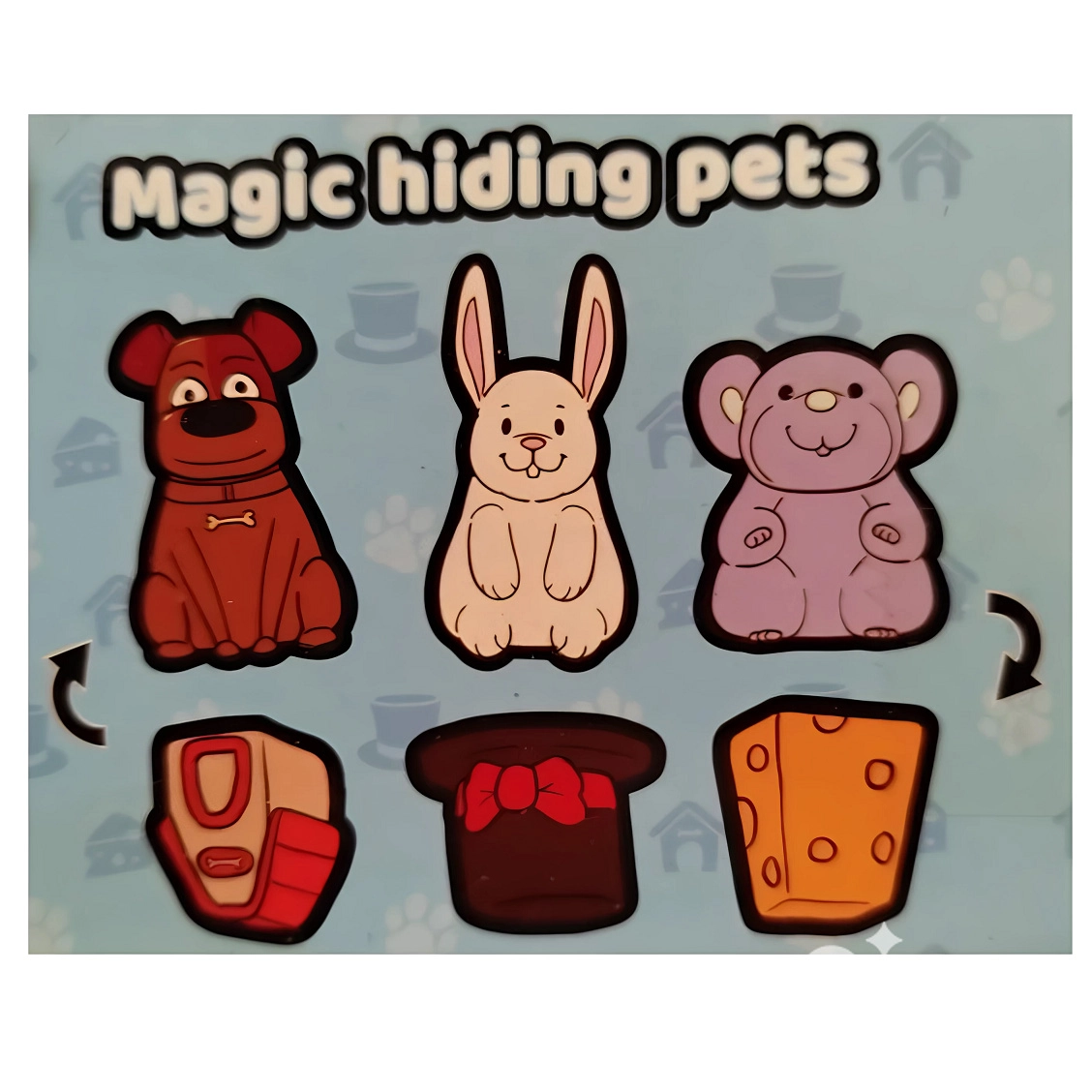 Valikus on 3 varianti: hiir ⇄ juust, küülik ⇄ kübar ja koer ⇄ kojak. Väikeste mõõtmete tõttu sobivad mänguasjad suurepäraselt seljakotti, autosse või ooteruumi. Pehme kummimaterjal on käe all mõnus ja igapäevaseks mänguks vastupidav.