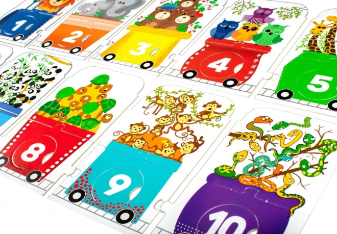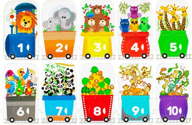 Lasteraudasõiduki kujuline pusle pakub lõbusat väljakutset väikestele avastajatele. See koosneb vedurist ja üheksast vagunist, igaühes erinev arv loomakesi: