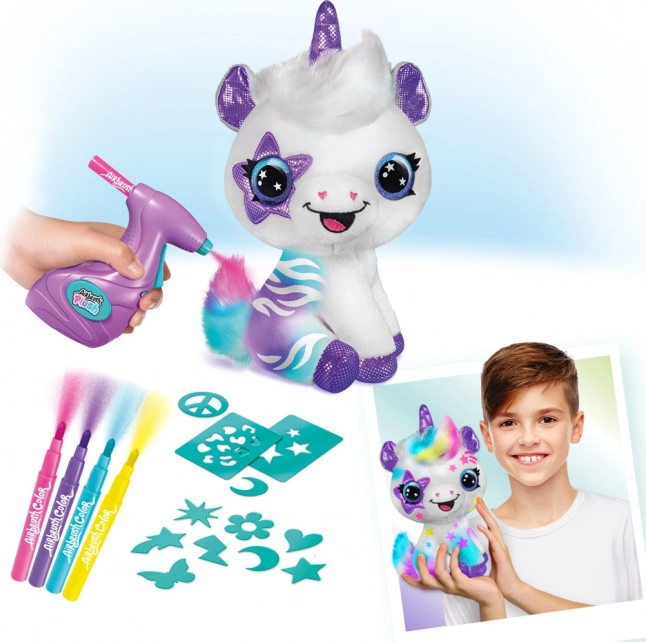 Muuda valge plüüdsest ükssarvik ainulaadseks teoseks. Lihtsa airbrushi tööriista ja isekleepuvate šabloonide abil lood tähti, südameid ja värviüleminekuid. Kui soovid muudatust, piisab loputamisest või pesust külmas vees ning saad taas luua.