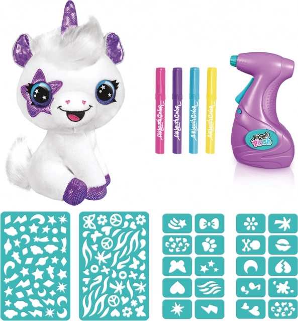 - Plüüdsest ükssarvik, airbrushi tööriist, 3 värvipadrunit, 120 isekleepuvat šablooni, plastist kaitsekindad, juhend
