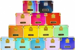 Iga käekott on stiilselt pakitud temaatilisse kohvrisse, mis sisaldab tolmukotti, paberist salvrätikut, kleebiseid ja tšekki koos dokumendiümbrisega.