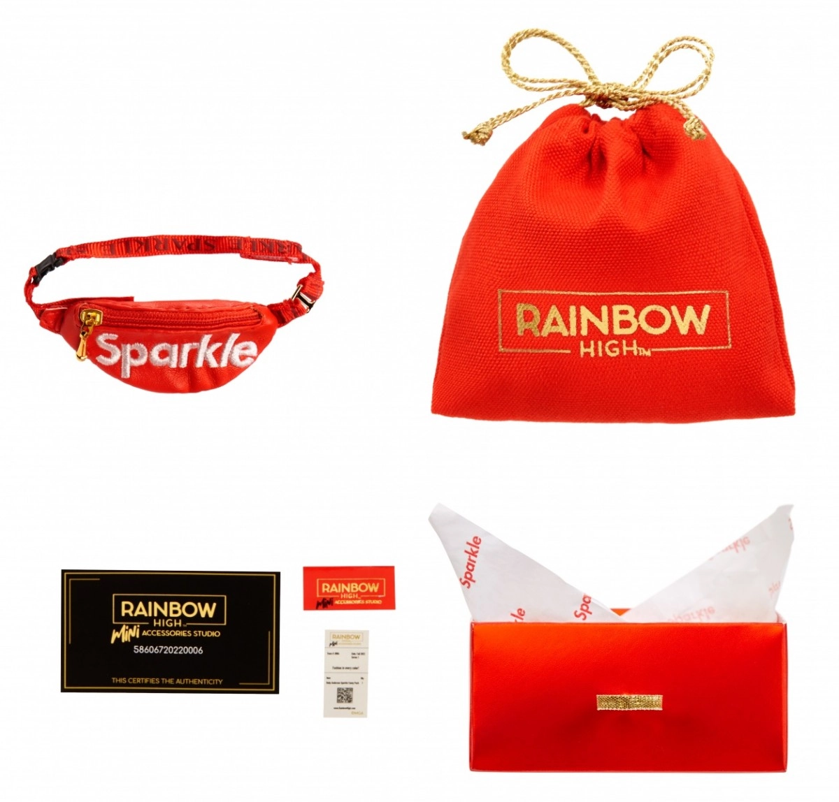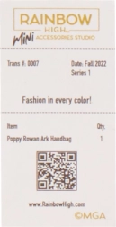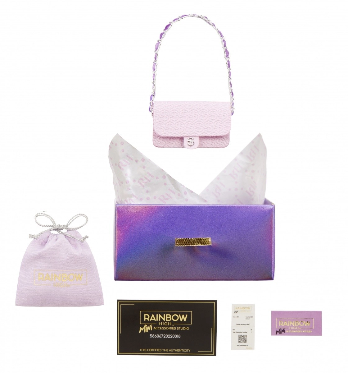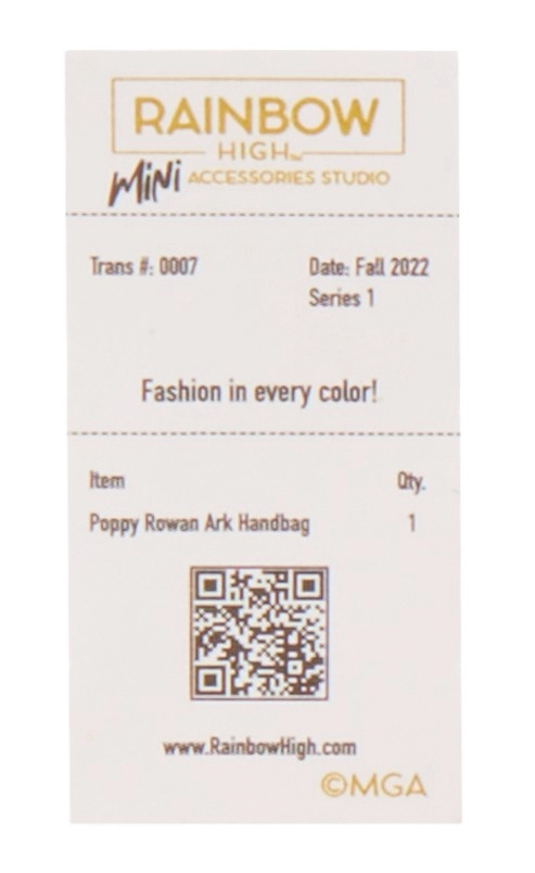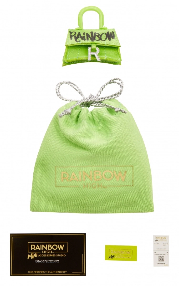 Kogust leiad 27 erinevat kotti, alates igapäevasest kuni õhtuse stiilini. Vali tote-kotid, seljakotid, vöökotid või õhtused clutch’id. Iga käekott on pakitud Rainbow High ikoonilisse kohvrisse, mis sisaldab tolmukotti, paberist salvrätikut, kleebist ja isegi prinditud tšekki koos sobiva dokumendiümbrisega.