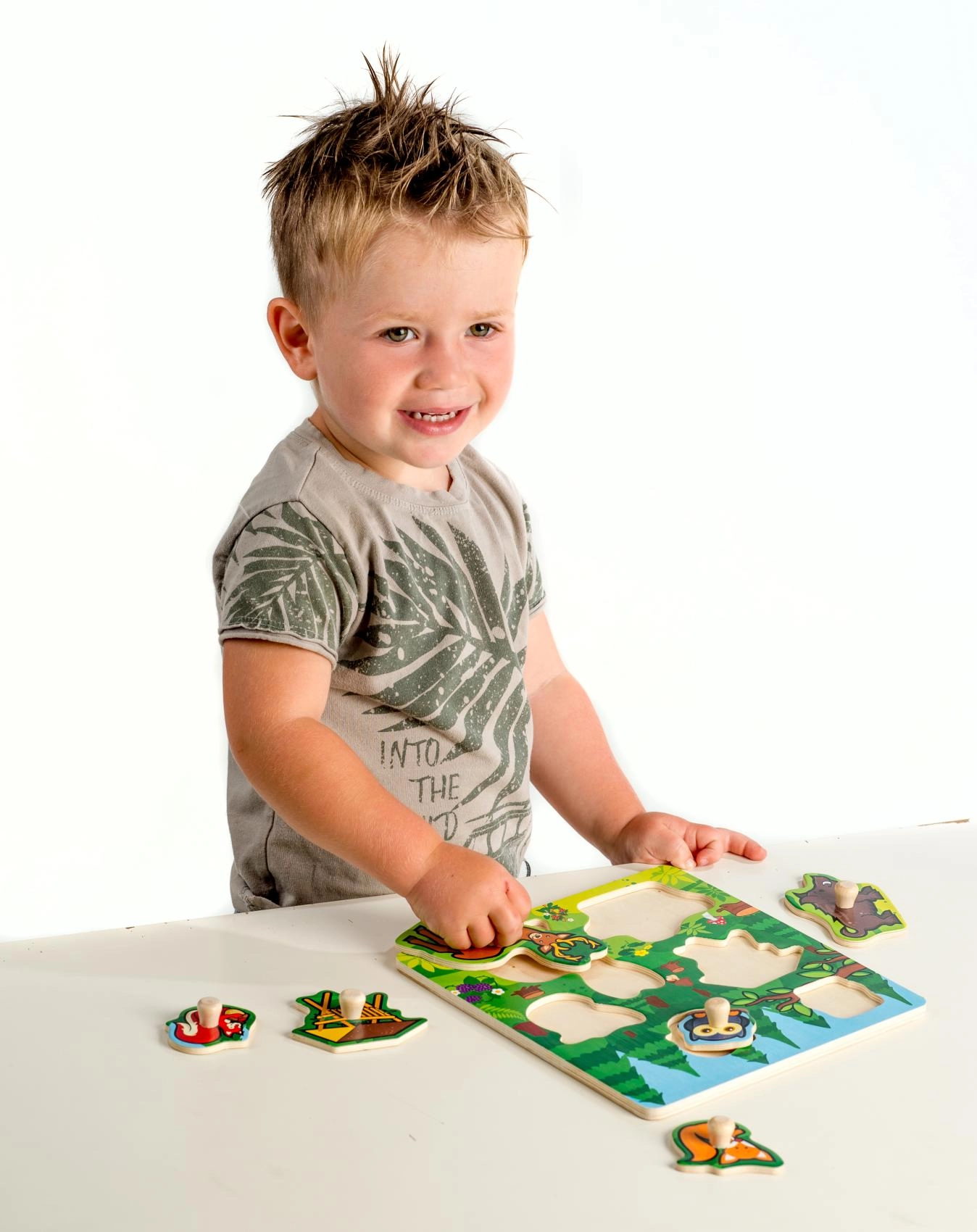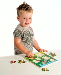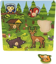 Metsateemad, nagu kassikakk, orav, metssiga ja hirv, innustavad avastama lõbusal viisil. Puidust alusraam hoiab iga tüki oma kohal ja lihtsustab õiget sobitamist nii kuju kui ka pildi järgi.