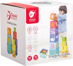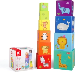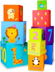 Need värvilised klotsid sisaldavad numbreid, loomi ja ingliskeelseid sõnu, aidates õppimisel ja kognitiivsete oskuste arengul.