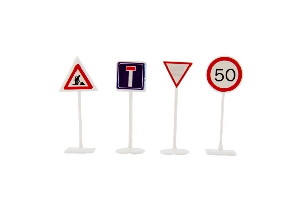Pakendis on mitmekesine valik märke – alates Stop-märgist ja peatee ning kõrvaltee märgistusest kuni keeldude ja käskudeni, samuti hoiatuskolmnurgad ja infotahvlid. Vastupidav plast sobib igapäevaseks mänguks ja on lihtne korrastada.