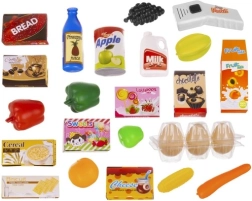 Komplektis on värvilised puu- ja köögiviljad, joogid, maiustused, munad ning toidukarbid. Realistlikud lisad toetavad õppimist mängu kaudu, toiduainete äratundmist ja sortimist. Tugev plastkonstruktsioon on vastupidav ja igapäevaseks mänguks ohutu.