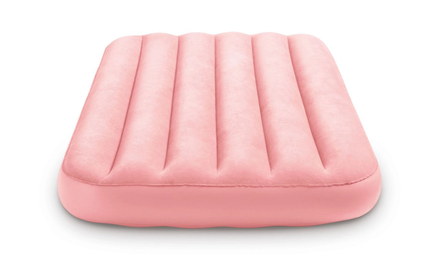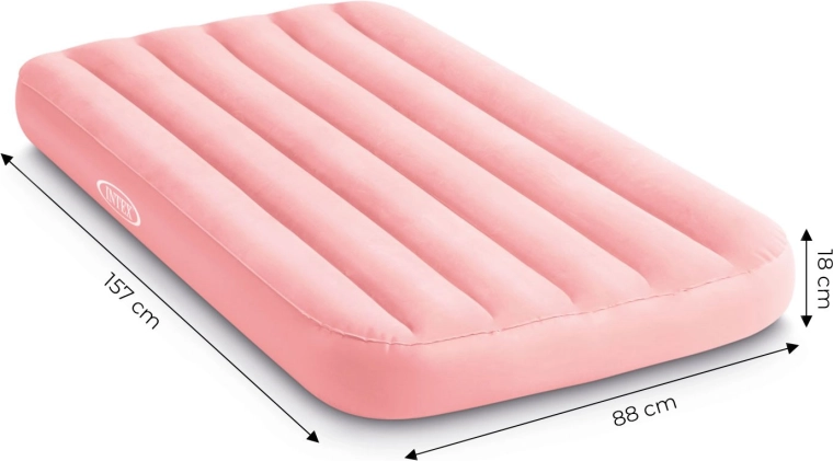 Kerge ja mugav INTEXi laste täispuhutav madrats mõõtudega 157 × 88 × 18 cm on ideaalne nii koju kui ka reisile. Sellel on pehme seemisnahkne (veluur) pealispind, tugev FIBER-TECH / DURA-BEAM konstruktsioon ja maksimaalne kandevõime 45 kg. Lihtne täis ja tühjaks lasta ning hoiustada, roosa värv rõõmustab väikseid magajaid.