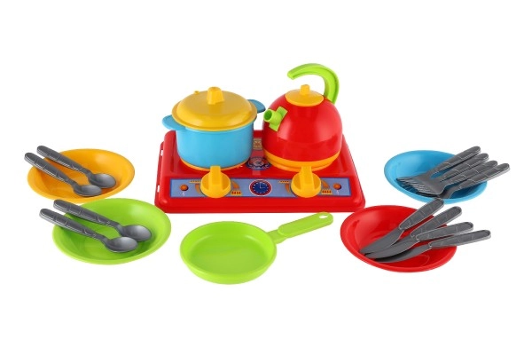Komplektis on kõik, mida lapsed vajavad lemmikmaiuste serveerimiseks nukkudele ja kaisuloomadele: kahe keeduplaadiga pliit, kann, pott kaanega ja taldrikud koos söögiriistadega. Realistlikud lisatarvikud toetavad suhtlemise, koostöö ja loovuse arengut lastemängus.
