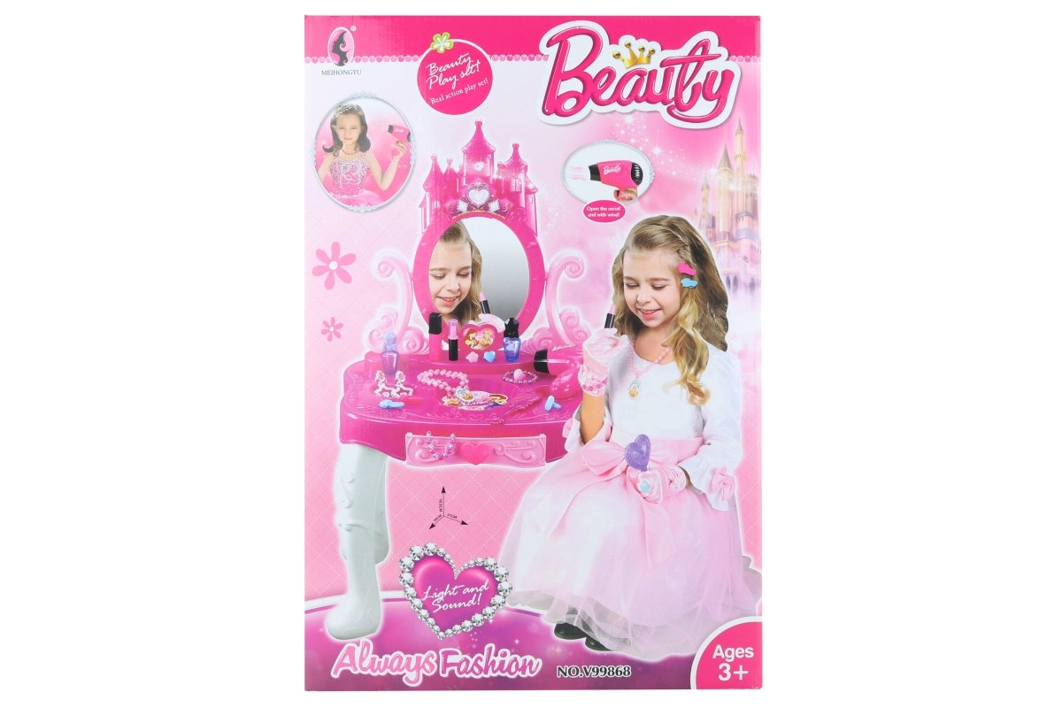 Ühe nupuvajutusega süttivad tuled ja hakkab mängima meloodia, lisades mängule ehedust. Komplekti kuulub ka mugav plastikust taburet. Kõik, mida teie laps vajab ilumänguks, on olemas!