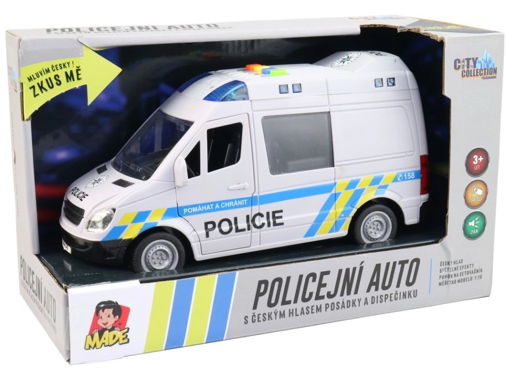 Realistlik politsei kaubik väikestele päästjatele pakub tšehhikeelseid meeskonna ja dispetšeri teateid, toimivat sinist vilkurit ja hõõrdejõul töötavat veosüsteemi. Avanevad uksed ja detailne viimistlus mõõtkavas 1:16 tagavad palju mängurõõmu. Auto pikkus on 21 cm, toide 3× 1,5 V AG13. Sobib alates 3. eluaastast.