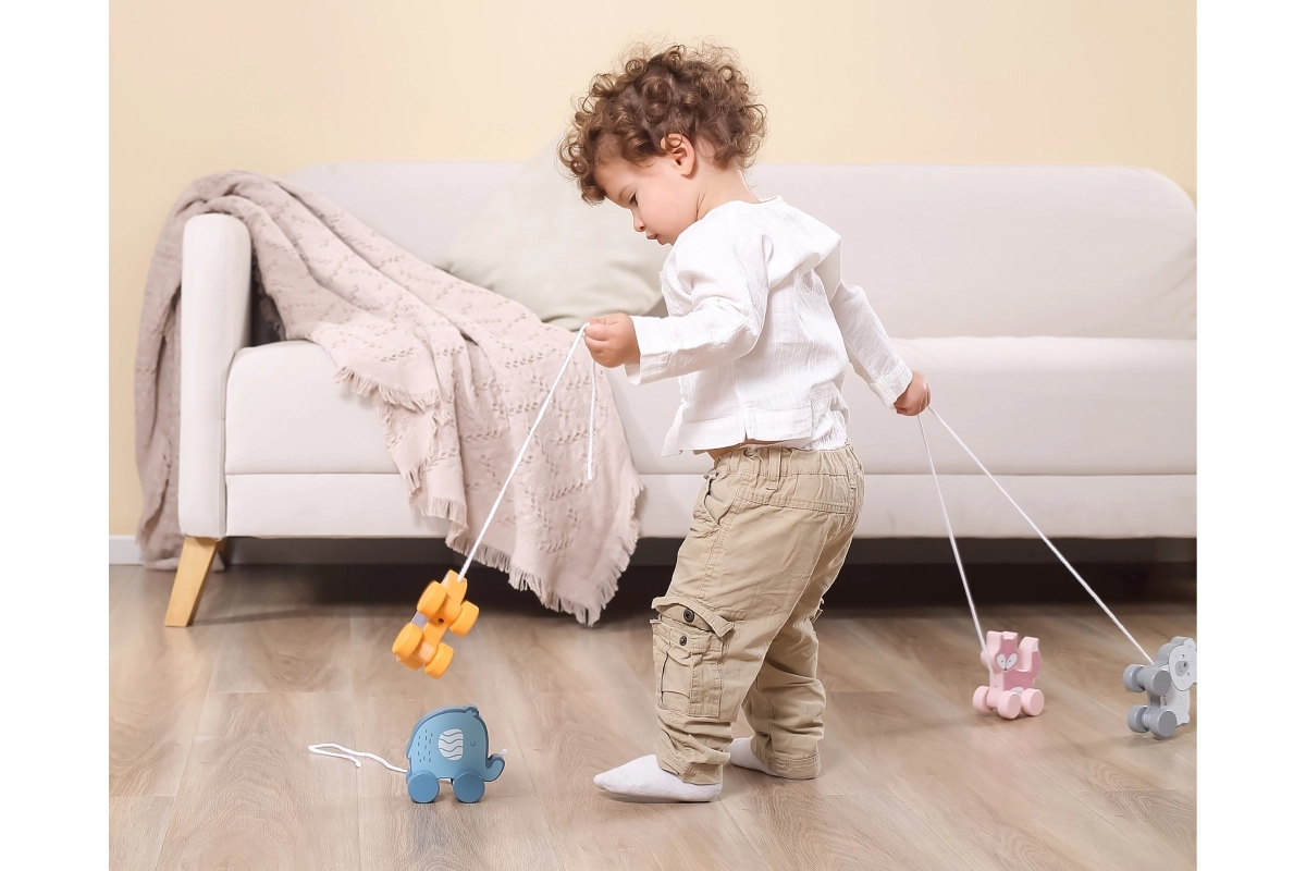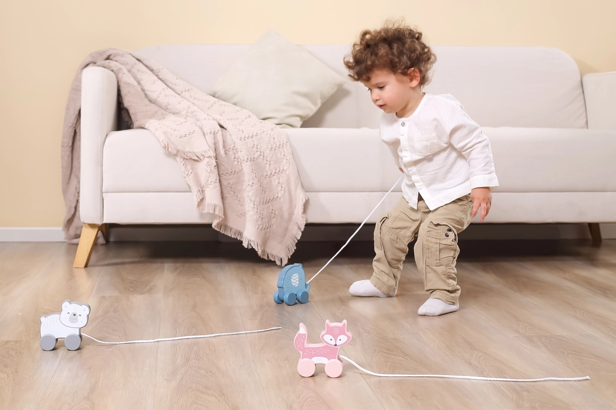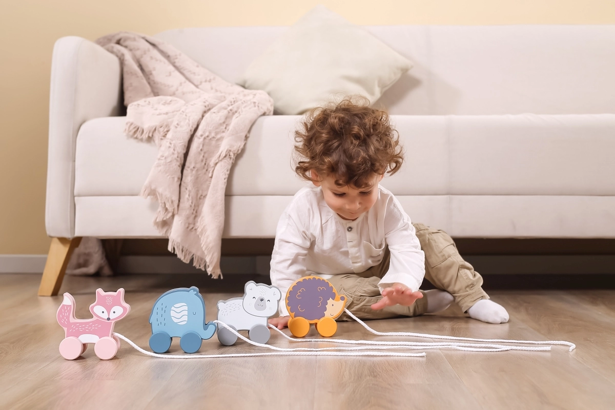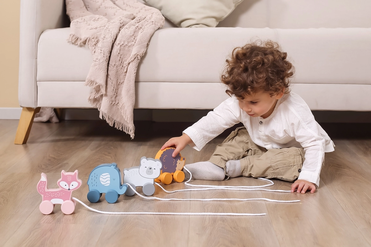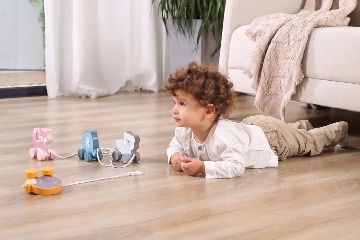 Tänu liikuvatele ratastele ja tõmbamisvõimalusele toetab mänguasi füüsilist arengut ja koordinatsiooni.
