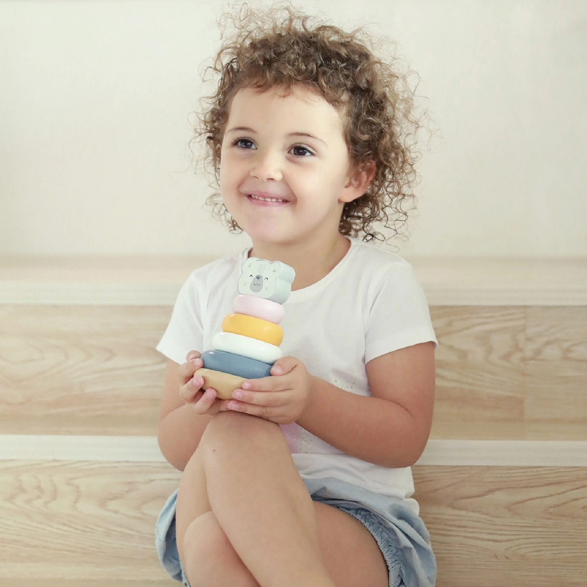 Komplekt sisaldab kuut pastelse värvitooniga rõngast, sh peamist rõngast karu peaga, mis arendavad visuaalseid ja motoorseid oskusi.