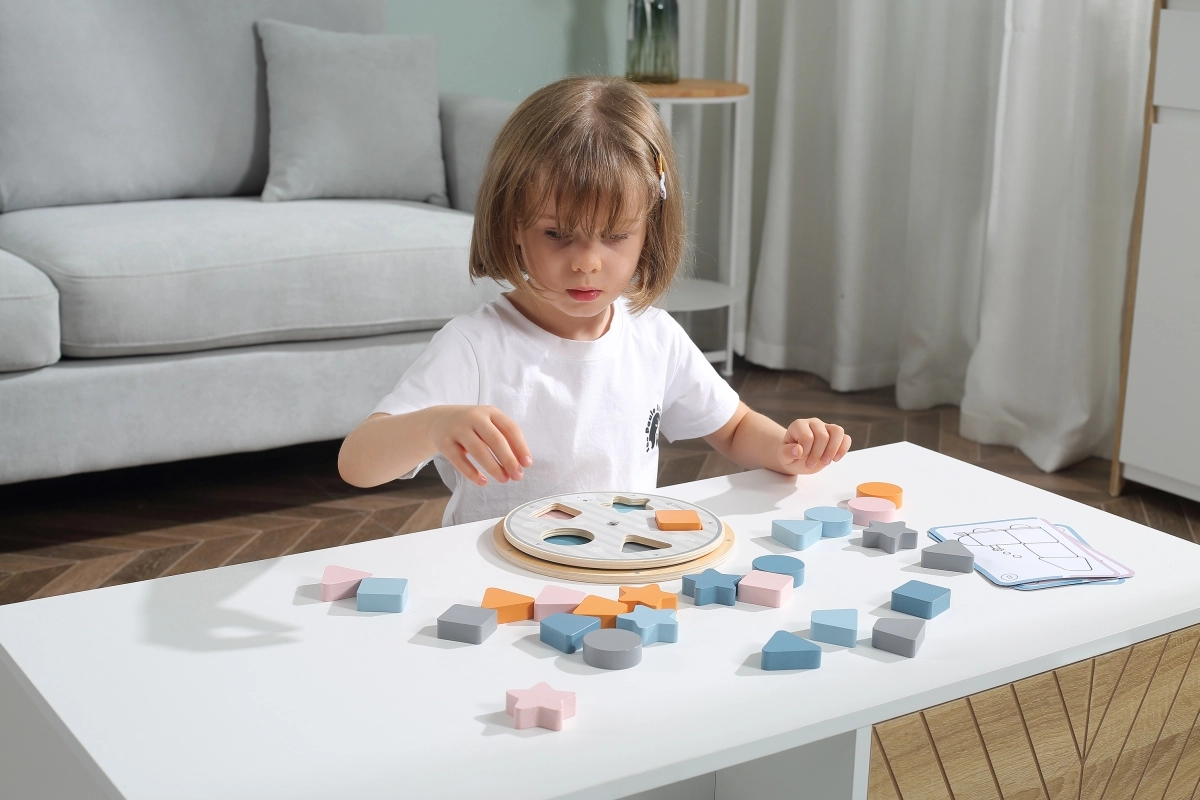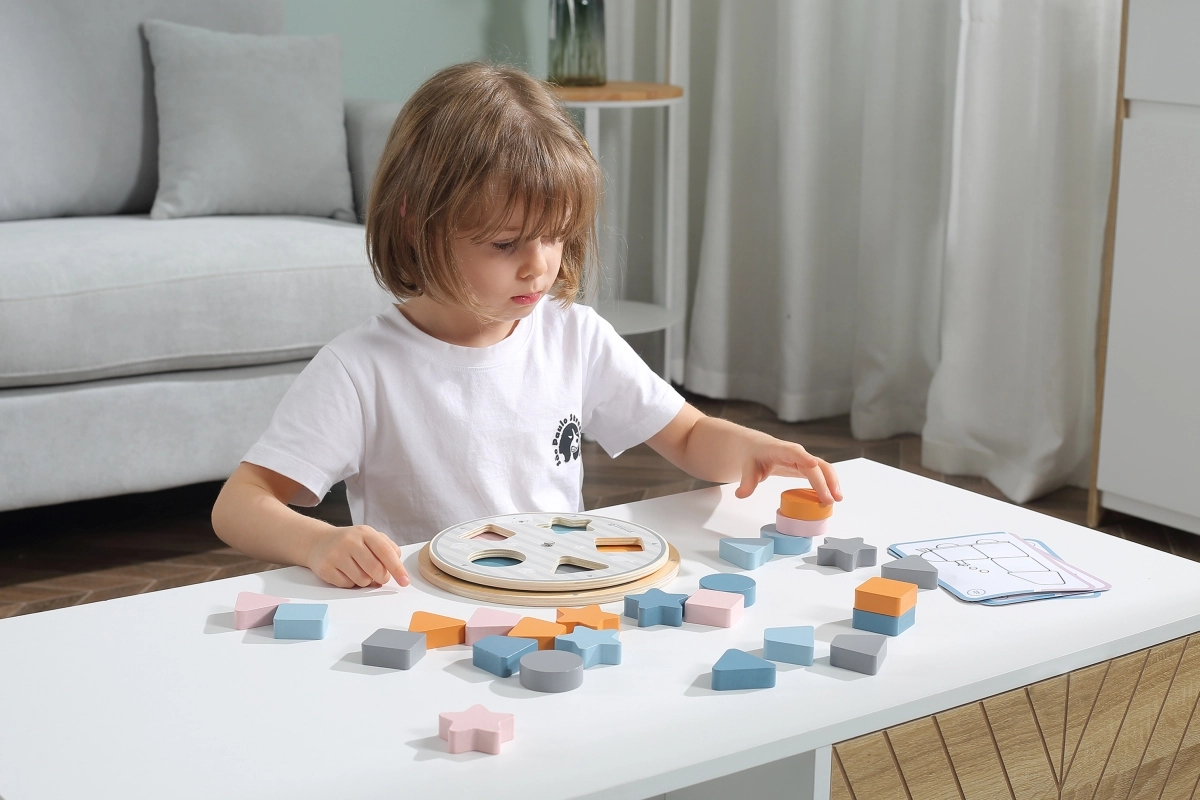 Lapsed sobitavad puidust tükid aluse väljalõigete sisse ning omandavad loomulikul viisil nii värvid kui ka põhilised kujundid – ring, ruut, kolmnurk ja täht.