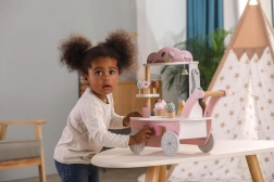 - Lastele loodud disain: õrnad pastelltoonid, kutsuvad detailid, kelluke ja rattad.