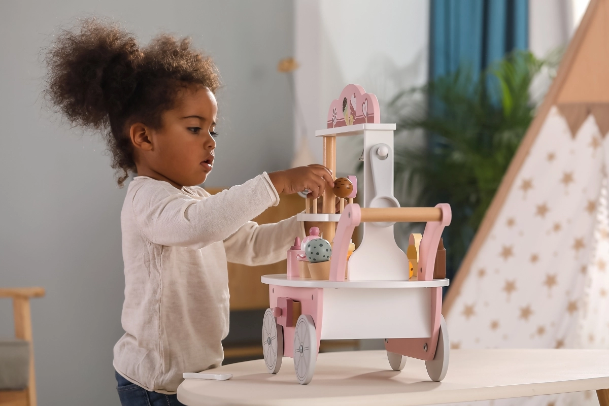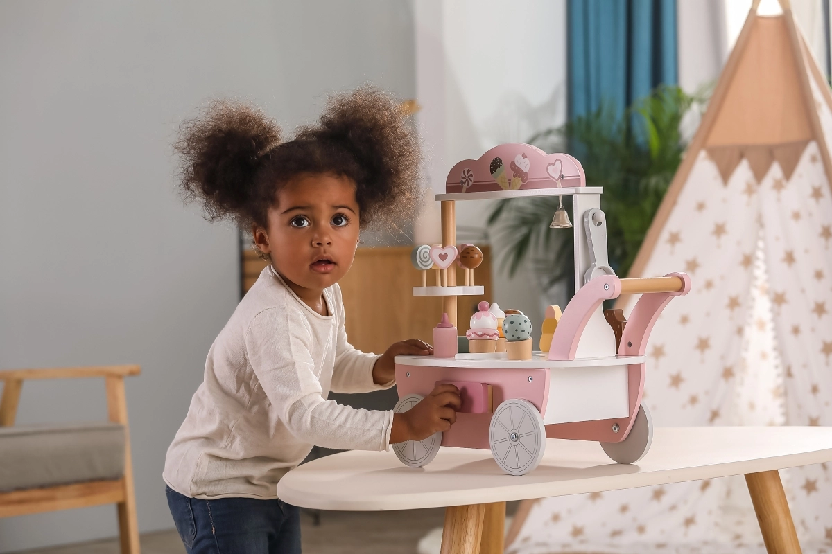 Üks kiosk, kolm mängustsenaariumi. Lapsed saavad pakkuda jäätist, müüa maiustusi või mängida poodi – kõik ühes kompaktses komplektis.