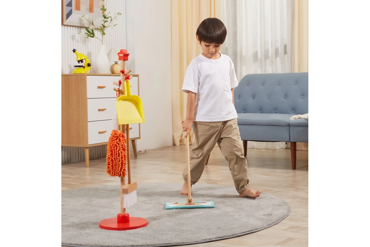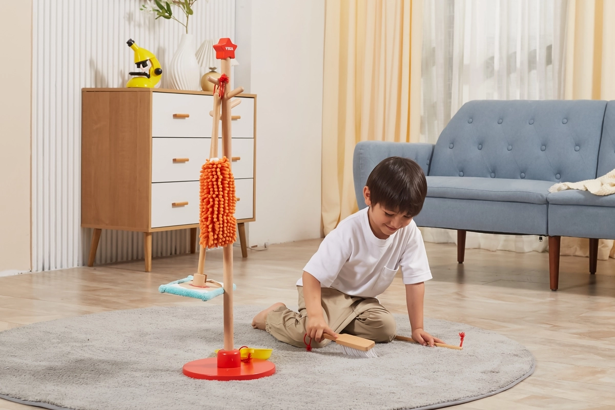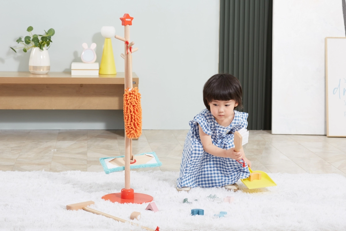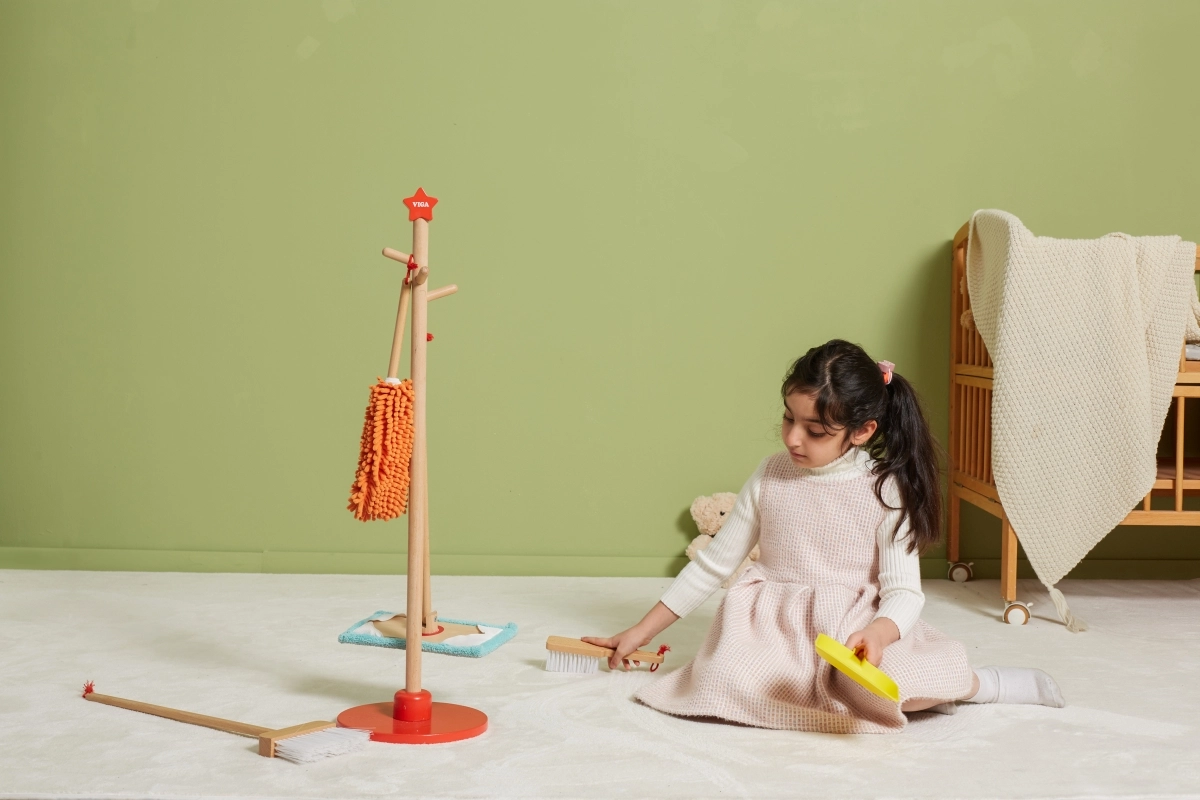 Viga puidust koristuskomplekt on ideaalne väikestele abilistele, kes tahavad aktiivselt korra hoidmisel kaasa lüüa. Tänu sellele komplektile, mis sisaldab harja, mopi, tolmulappi ja teisi vahendeid, arendavad lapsed oma motoorseid oskusi ja õpivad mängides vastutust.