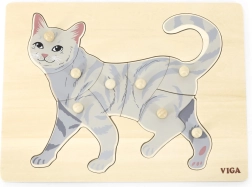 Lapse ülesanne on kokku panna kassi pilt mitte ainult illustratsiooni, vaid ka üksikute tükkide kuju järgi. Nupptüüpi käepidemed hõlbustavad haaramist väikeste sõrmedega ja toetavad käe õiget juhtimist. Tugev puidust alus hoiab tükke kindlalt paigal ja peab vastu igapäevasele kasutusele.