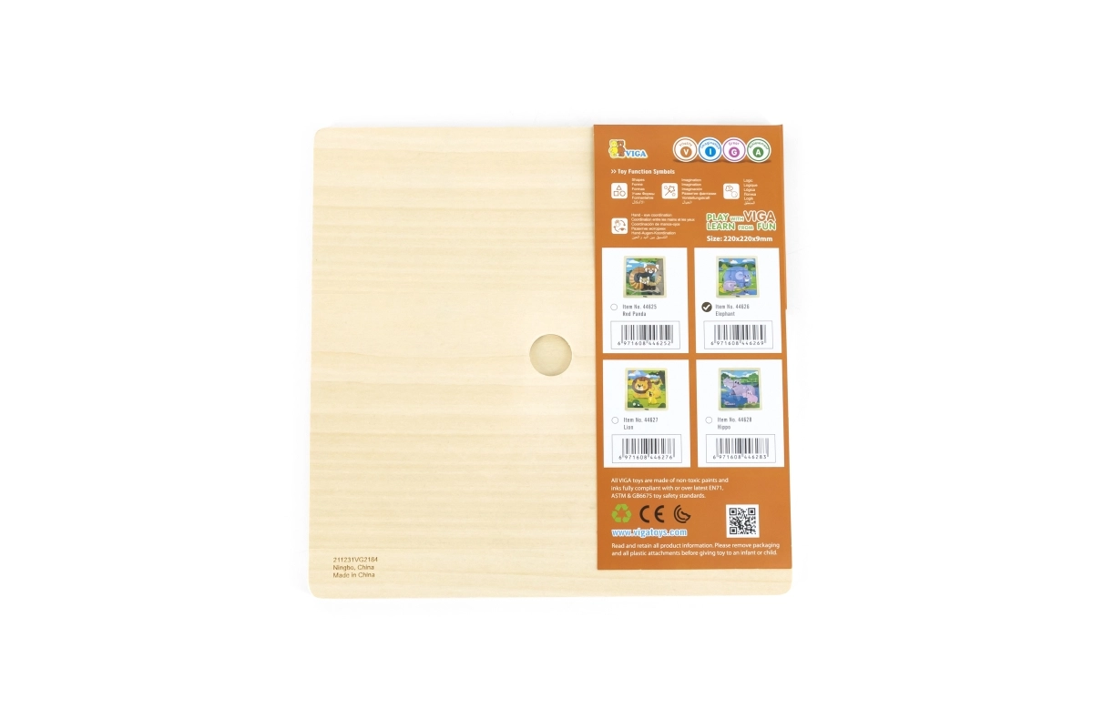 Klassikaline puidust pusle lõbusa elevandimotiiviga on ideaalne esimene komplekt kõige pisematele. Tugevaid tükke on lihtne haarata ja need sobituvad kaasasolevale alusele, mis aitab orienteeruda ja hoiab pildi koos.