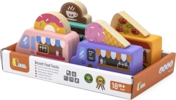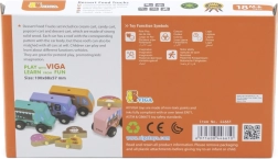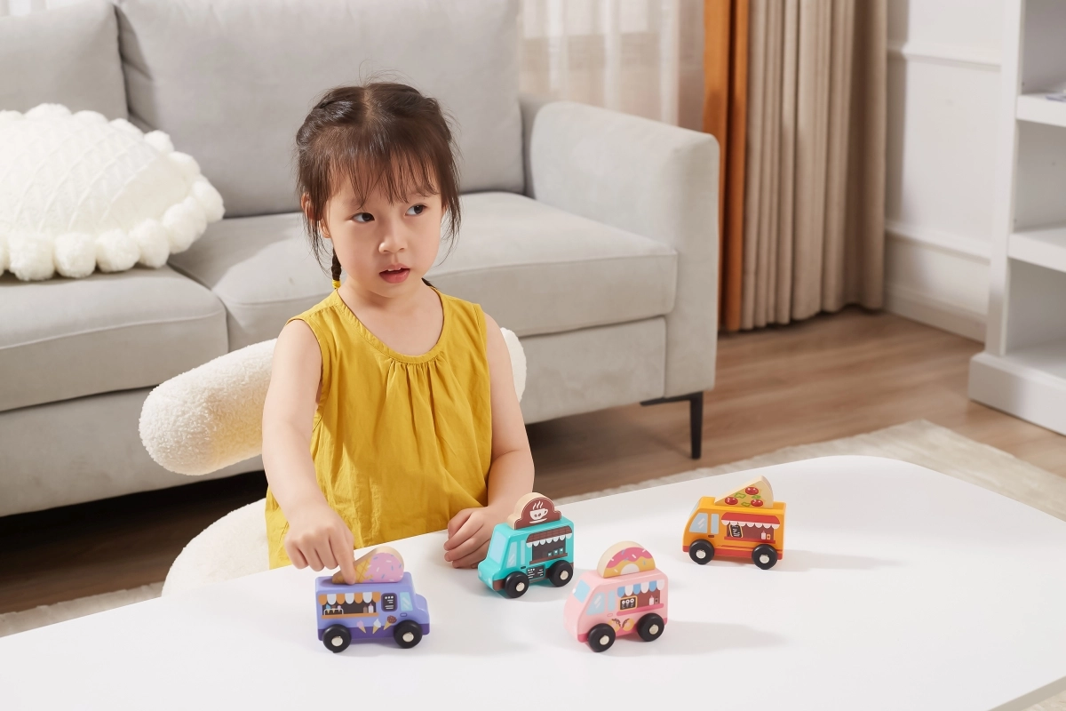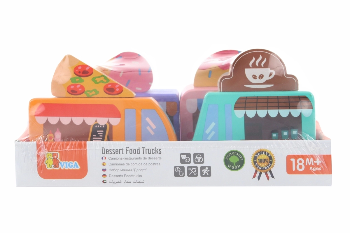 Viga puidust toiduveokite komplekt toob neli armsat ratastel sõidukit pastellvärvides koos detailsete trükistega. Igal veokil on temaatiline bänner – pitsa, kohv, jäätis ja sõõrikud – mida saab vabalt vahetada, et lapsed saaksid luua oma lugusid ja müügikohti. Kvaliteetne puit ja mittetoksilised värvid tagavad turvalise ja kauakestva mängu.