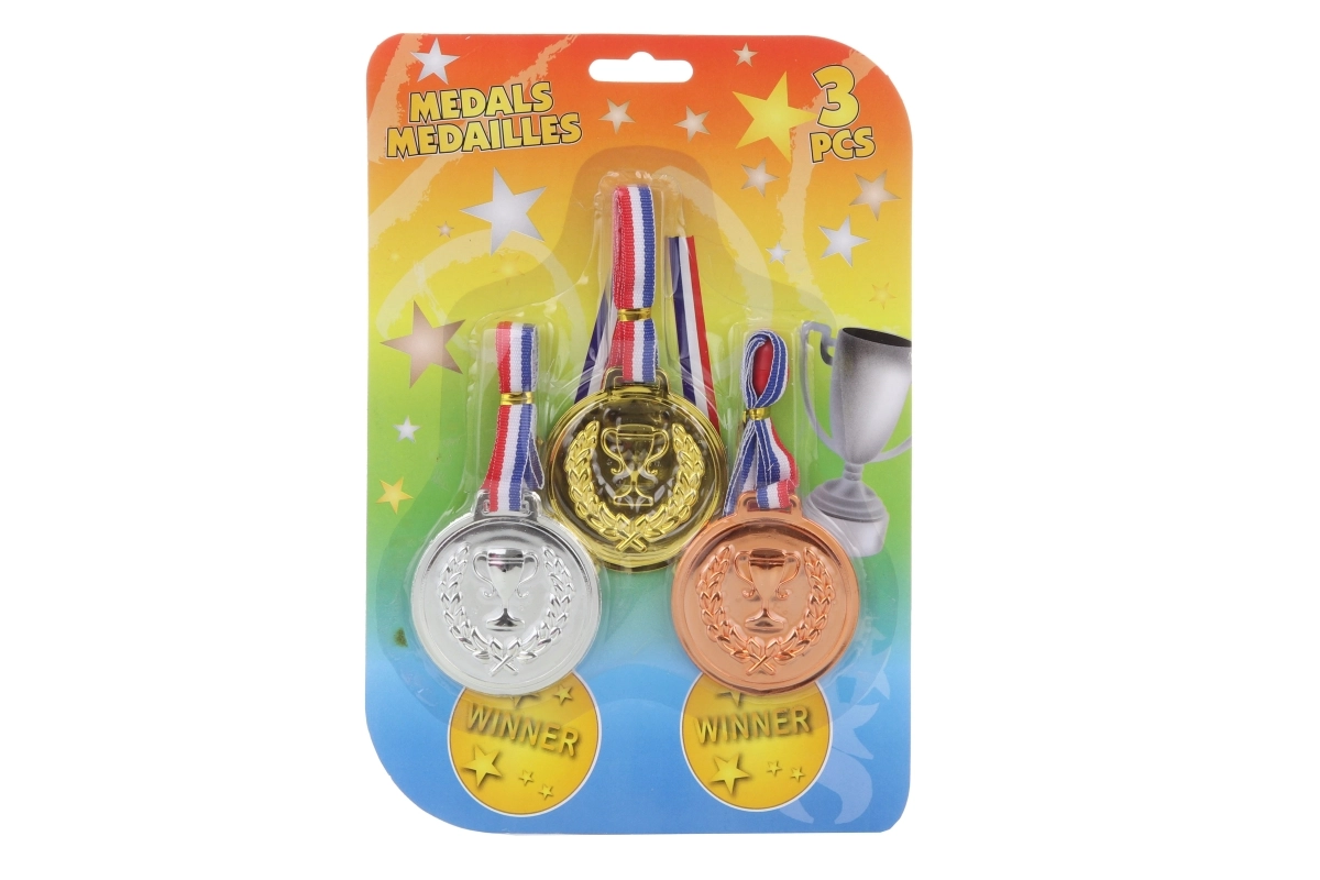 Premeeri väikseid võitjaid stiilselt kolme medali komplektiga – kuldne, hõbedane ja pronksine. Igaühe läbimõõt on umbes 6 cm ning need sobivad lastele alates 3. eluaastast. Ideaalne võistlusteks, lasteaedadesse, sünnipäevamängudeks ja pereturniirideks.