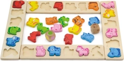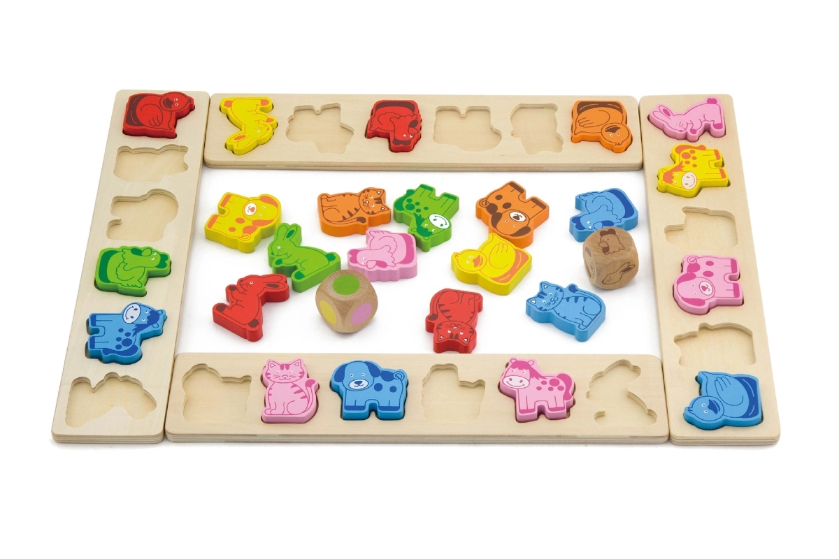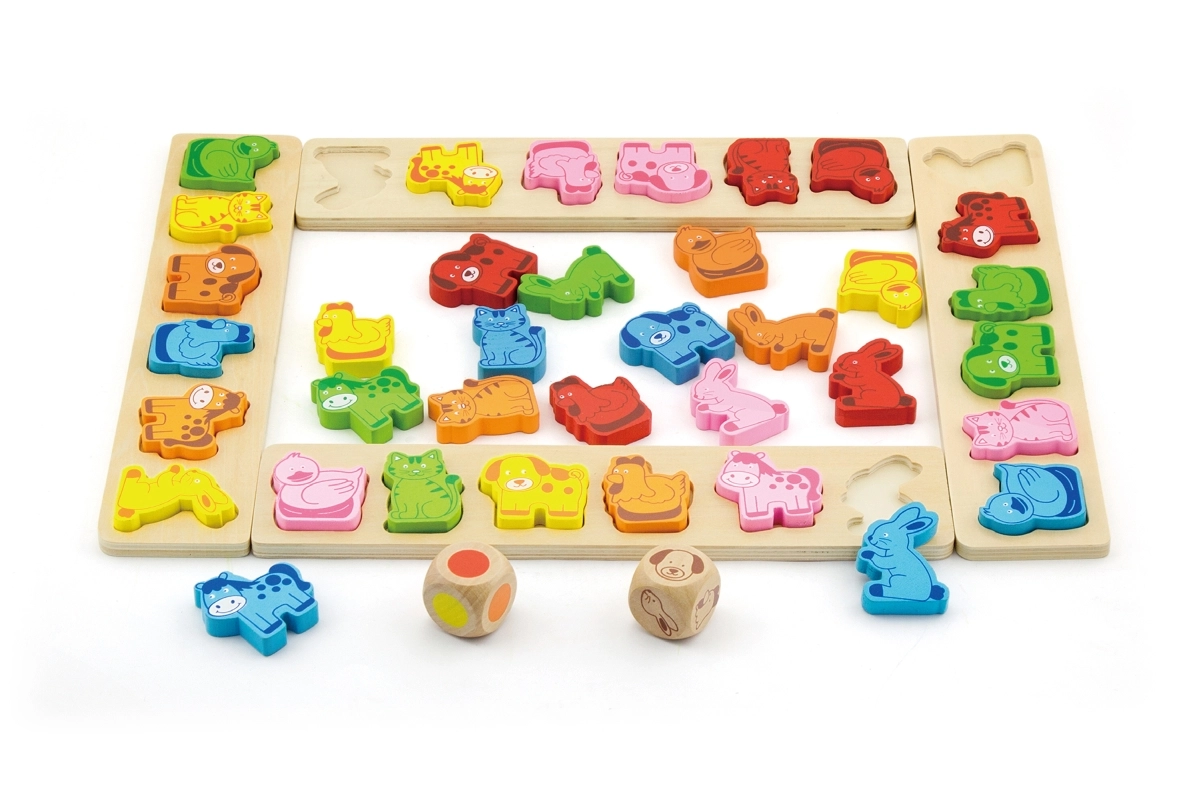 Lõbus puidust mäng lastele alates 3. eluaastast, mis arendab värvide ja loomade äratundmist, treenib kiiret mõtlemist ja reageerimist ning toetab keele-, arvutus- ja meeskonnaoskusi. Kvaliteetsest vineerist ja pöögipuidust komplekt sisaldab 4 lauda, 36 loomatükki ja kahte täringut – värvitäringut ja loomadega täringut.