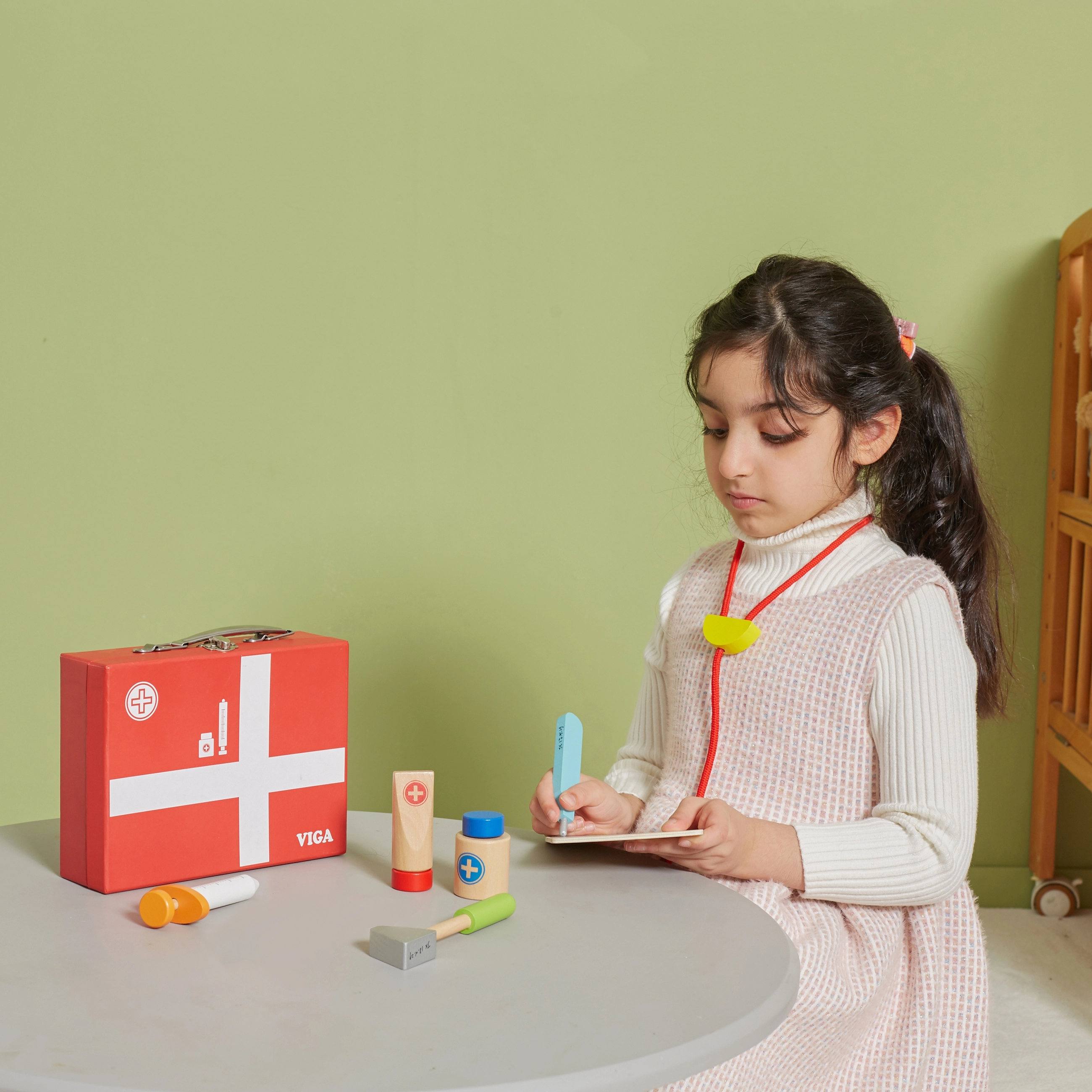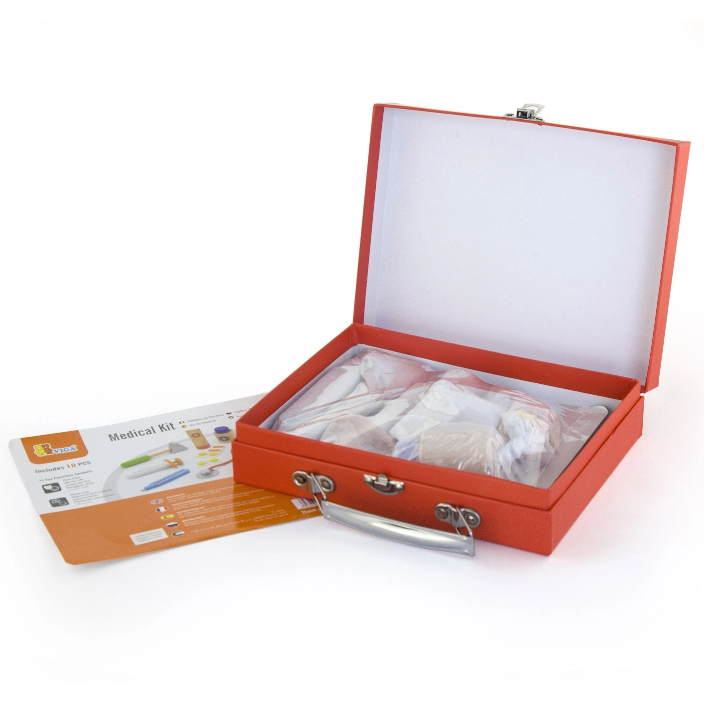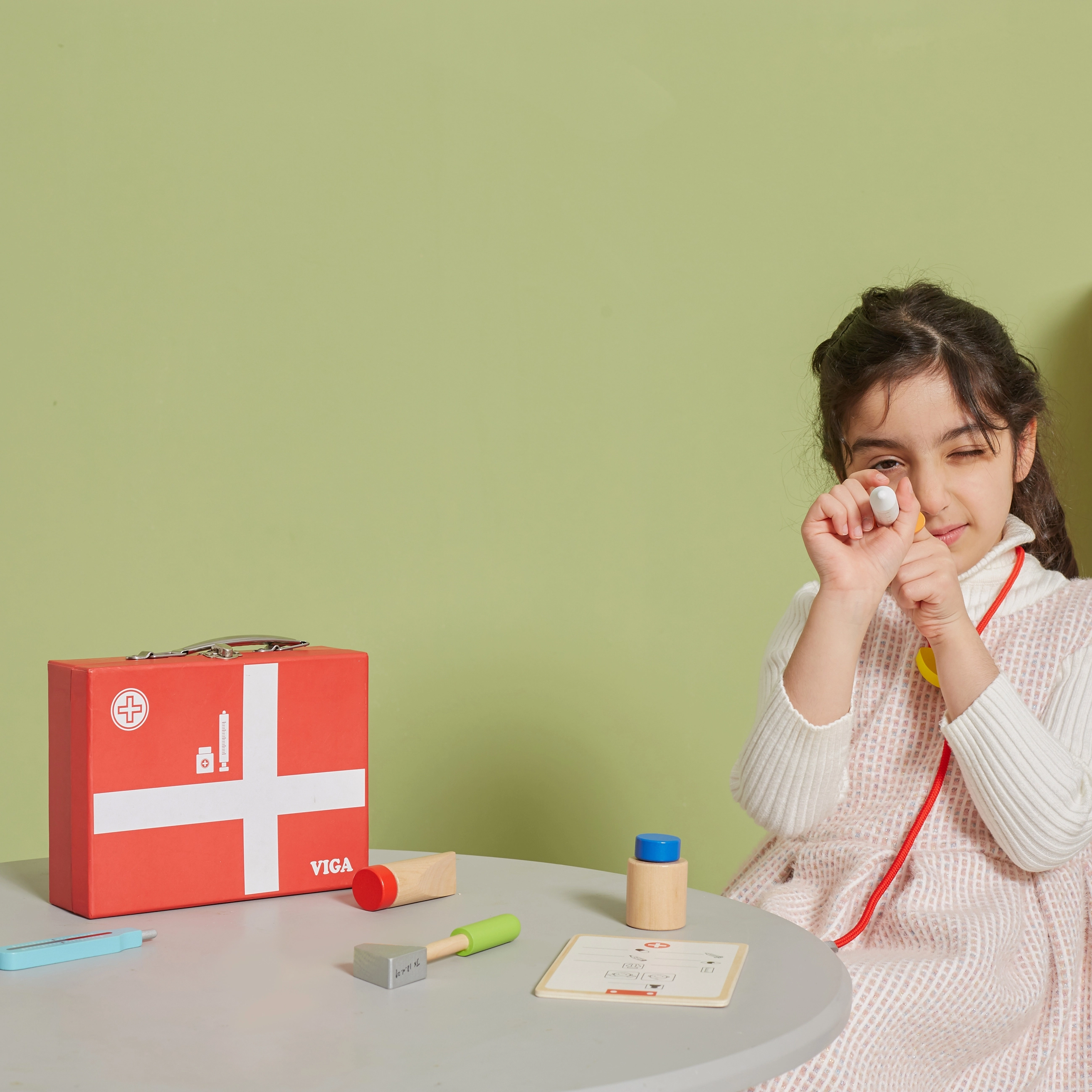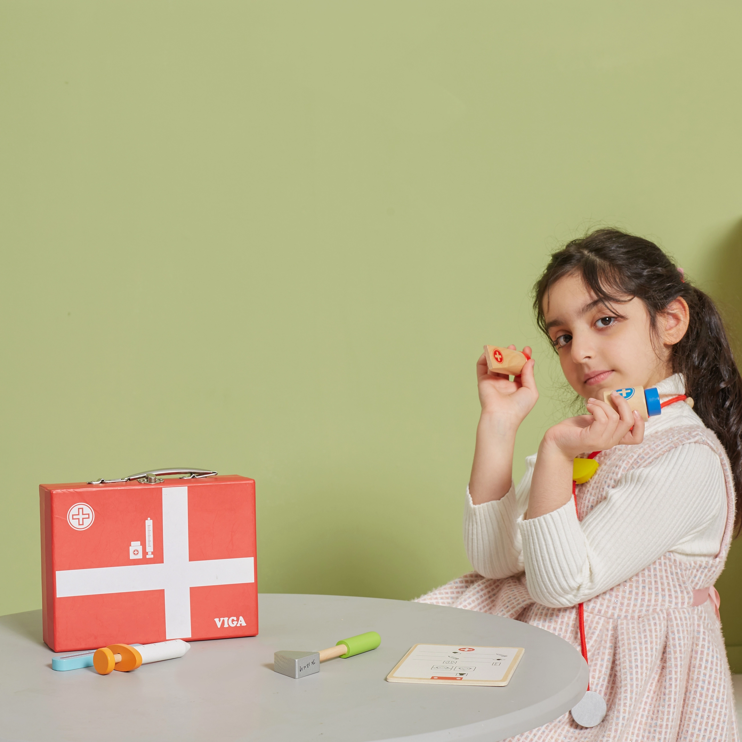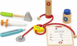 See kaunis arstipakk tugevast puidust kohvris rõõmustab kõiki väikeseid arste. Lapsed saavad kuulata südant stetoskoobiga, “mõõta” temperatuuri termomeetriga, teha süsti või täita patsiendikaarti kaisukatele ja nukkudele. Arstiks mängimine on lõbus rollimäng, mis arendab sotsiaalseid oskusi, tundlikkust ja empaatiat.