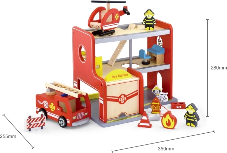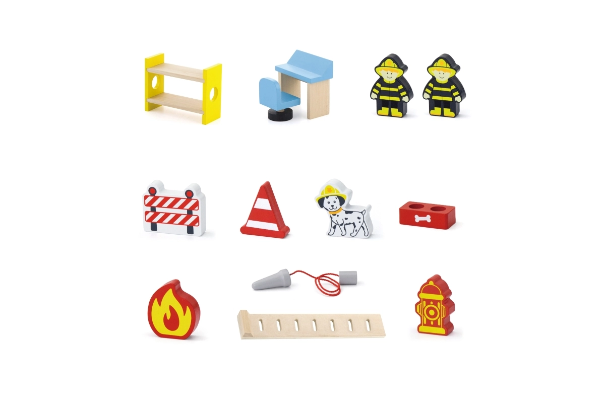 Pakendis on kõik, et kohe mängima hakata: depoohoone, 2 tuletõrjujat, helikopter, tuletõrjeauto, hüdrant, narivoodi, tool, juhtpult ja redel. Materjalid ja värvid on ohutud ja mürgivabad, et lapsed saaksid muretult mängida. Ideaalne kingitus, mis rõõmustab ja peab vastu.